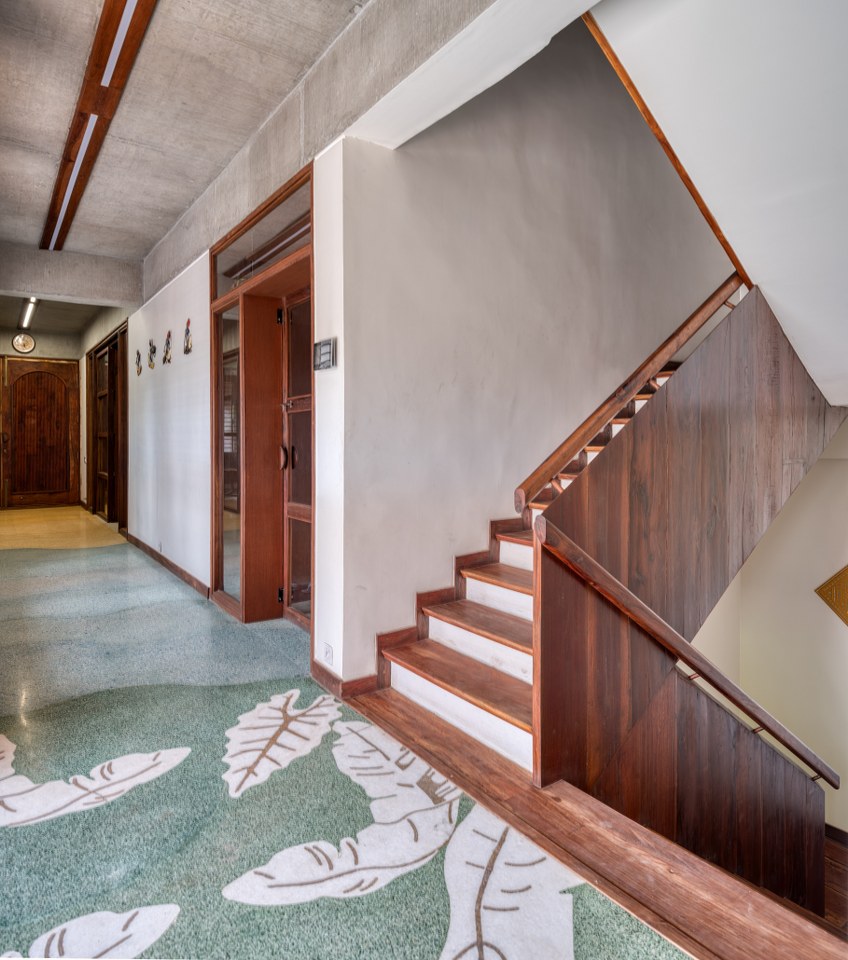 Connecting the two floors is a striking staircase, Plain solid wooden planks crowned with a plain balustrade defines contemporary approach to design of staircase railing. The creative vocabulary prevalent in the house extends to the passage, where an extended studded marble leafs a part of whole