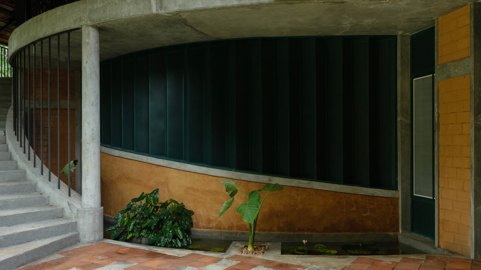 Transitions are expressed with care. A red arched entry signals the passage from plantation to dwelling, a singular gesture of arrival amid openness. On the western side, a slender water body follows the curve of the veranda, reflecting sky and greenery while cooling the interiors. It becomes a contemplative surface, blurring the threshold between inside and outside.