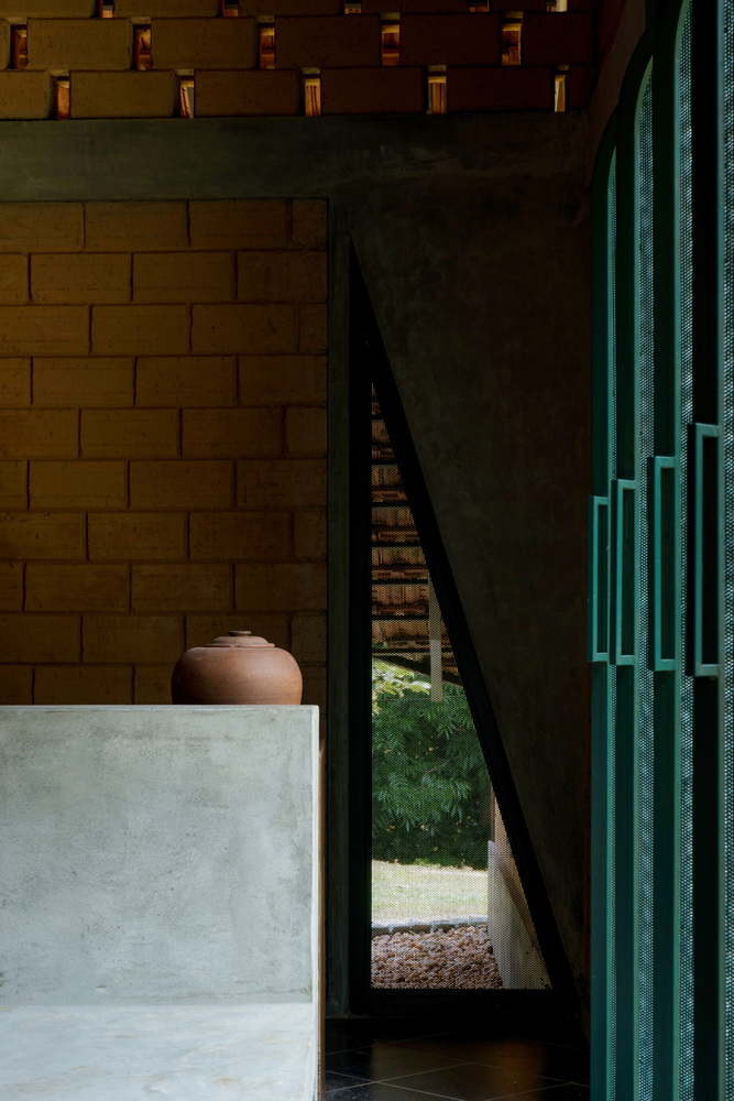 Material choices reinforce the home’s connection to place. Mud interlock bricks form the walls, while a rammed poured earth wall lends texture, strength, and thermal mass. Reused roof tiles and reclaimed floor tiles add layers of character and continuity, grounding the new dwelling in a sense of memory. Even in the floor concreting, plastic waste is blended into the mix, giving discarded matter renewed purpose.