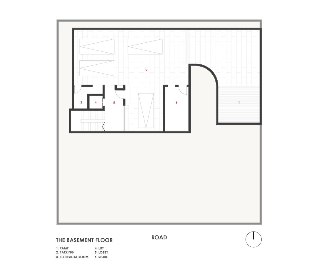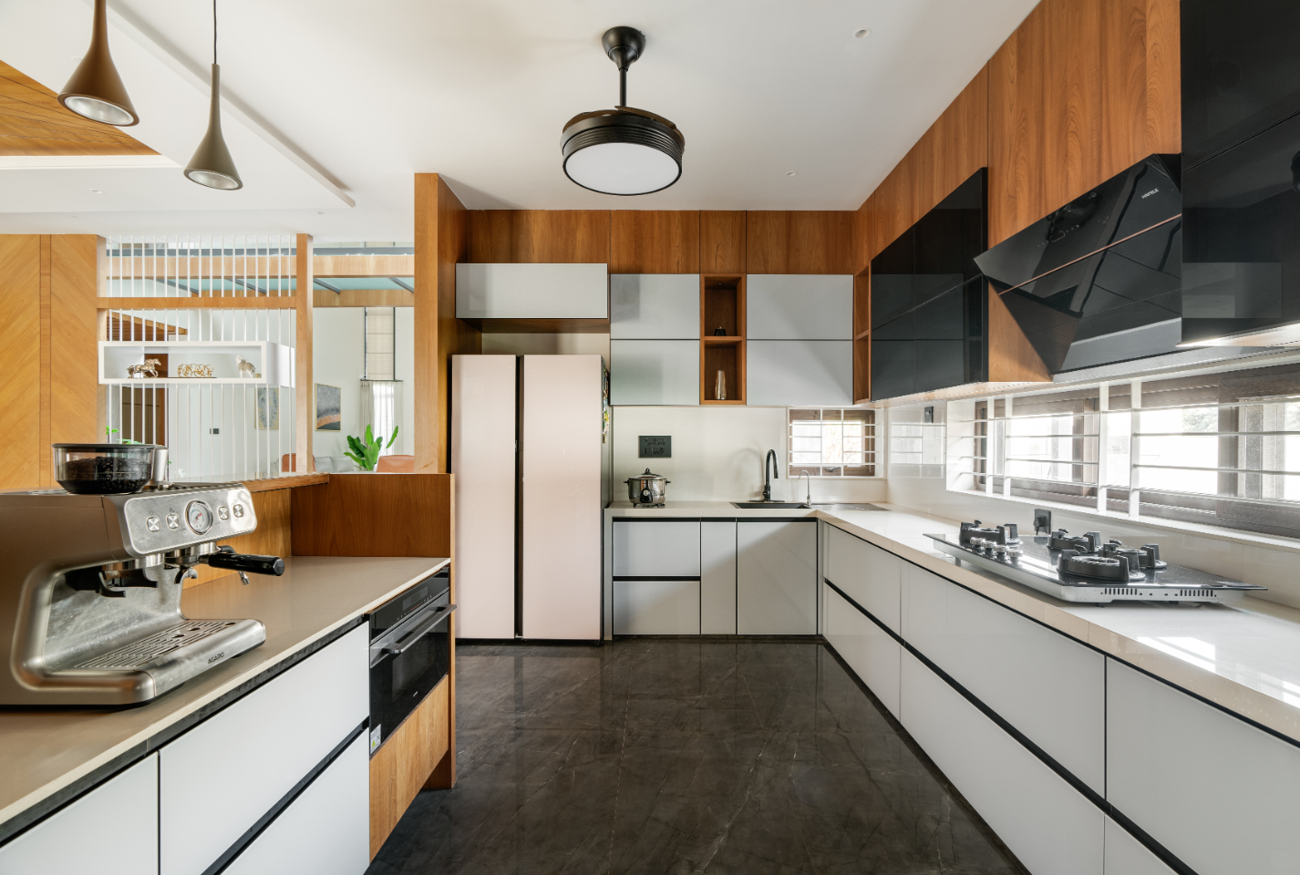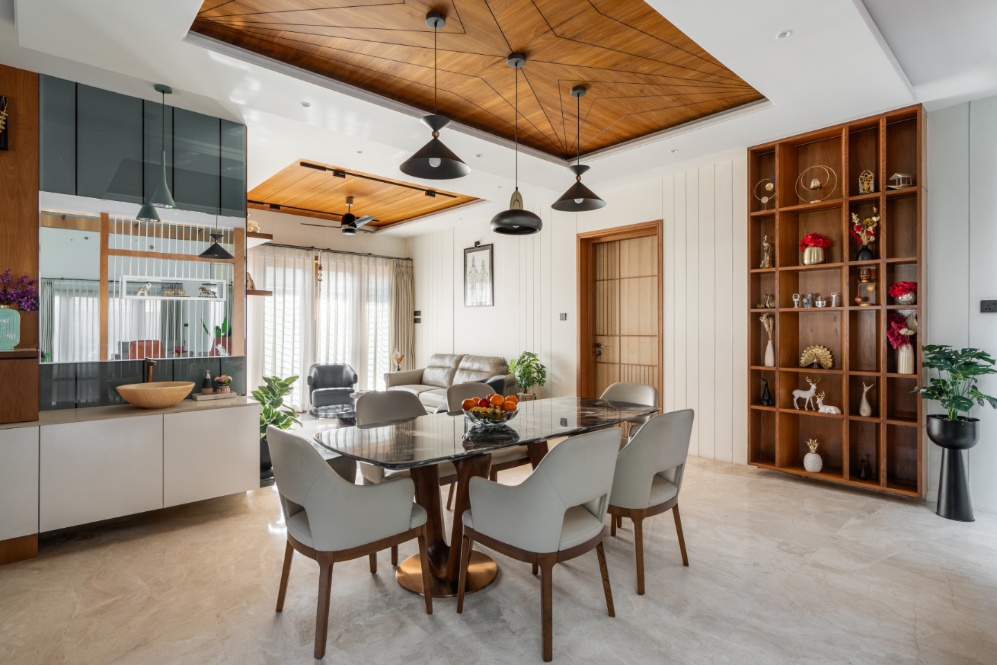 The design of this semi urban home organizes the ground floor with a clear separation between public and private spaces. Towards the front of the house lie the foyer, living, dining, puja, and kitchenareas—spaces meant to be accessible and welcoming for both residents and guests.