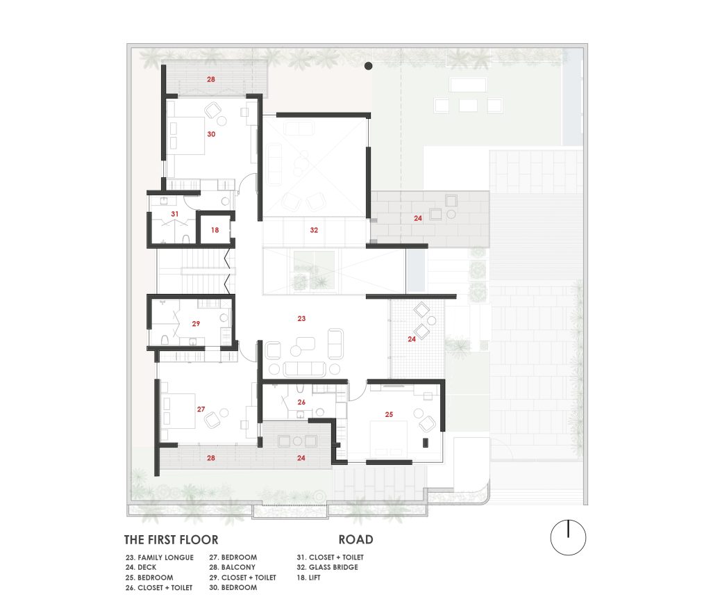 Moving to the first floor, the layout centres around a dramatic glass bridge that spans the courtyard below. This bridge connects the two wings of the upper level and reinforces the home’s vertical transparency, allowing views across different levels. It also enhances the openness of the house, making the circulation space an architectural feature in itself.