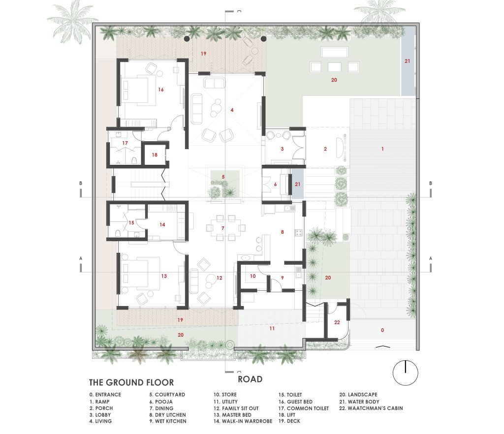 At the heart of the layout is a central courtyard, which serves as a spatial and visual anchor. This open-to-sky feature improves cross-ventilation, brings in natural light, and facilitates fluid movement throughout the house.