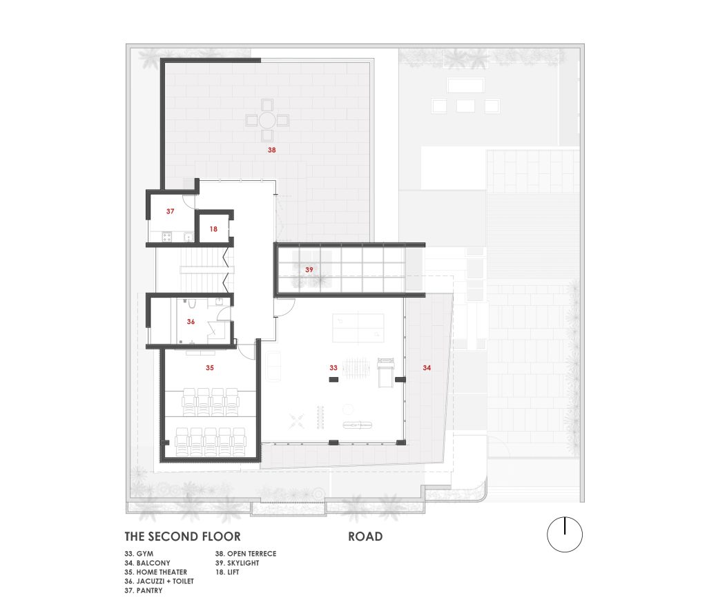 The second floor is dedicated to leisure and wellness. A spacious recreation room sits at its core, designed to host fitness equipment, games, and informal seating. This room is surrounded by open terraces, allowing for panoramic views and natural ventilation.