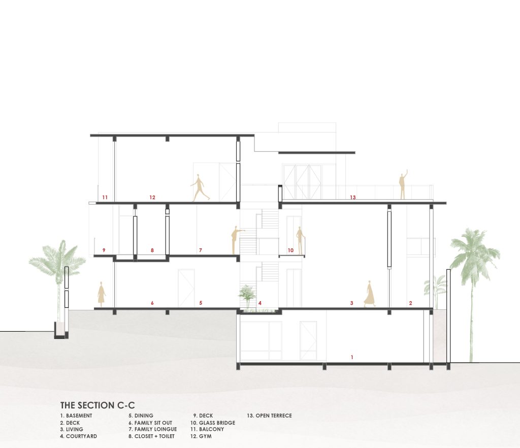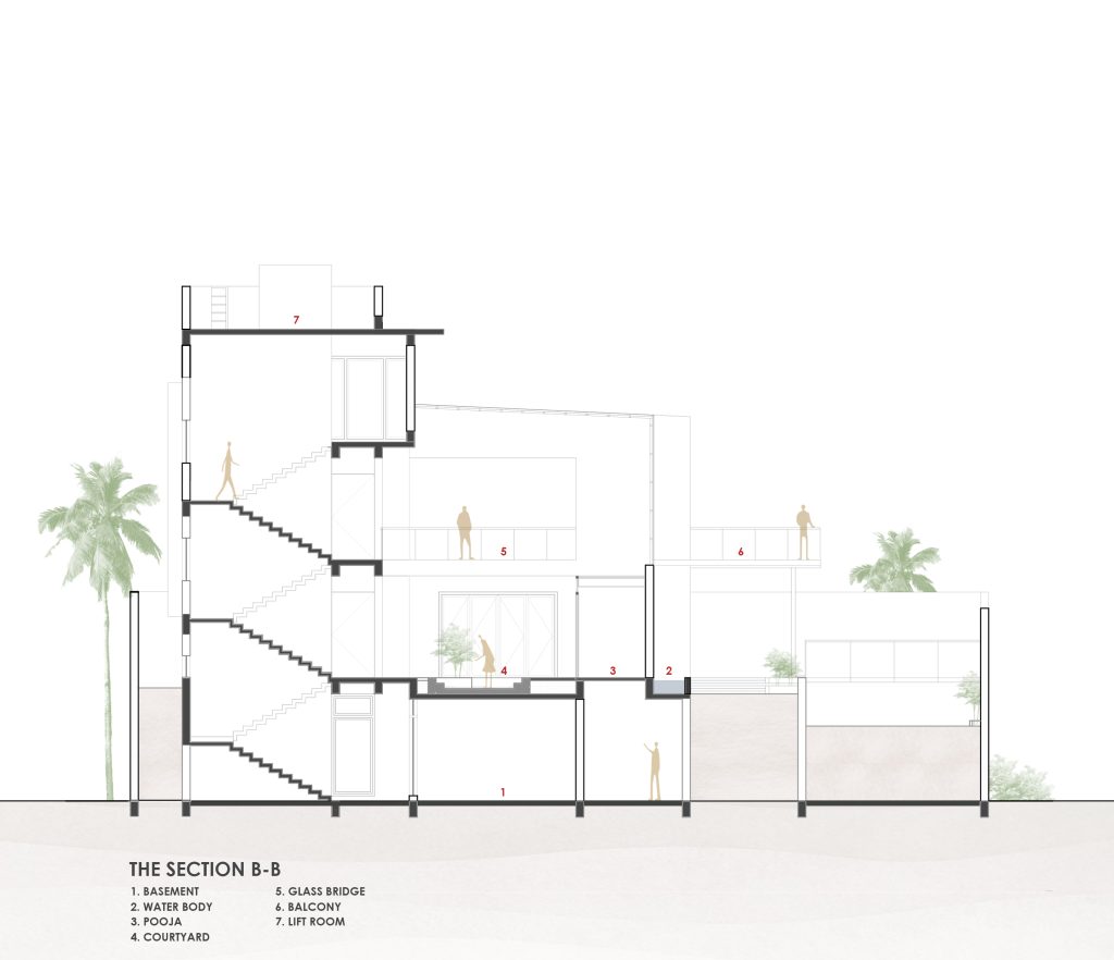 There are three bedrooms, each positioned to ensure privacy and outfitted with balconies that offer serene views and a sense of personal retreat. The staircase connects directly to the glass bridge, reinforcing smooth movement across floors.