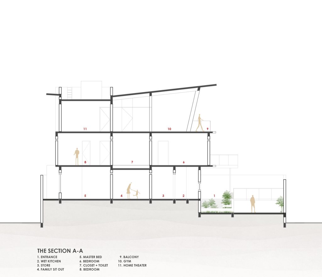 Around this central bridge are a mix of private and semi-private spaces. A family lounge forms the social core of the floor, opening out onto terraces that encourage outdoor living.