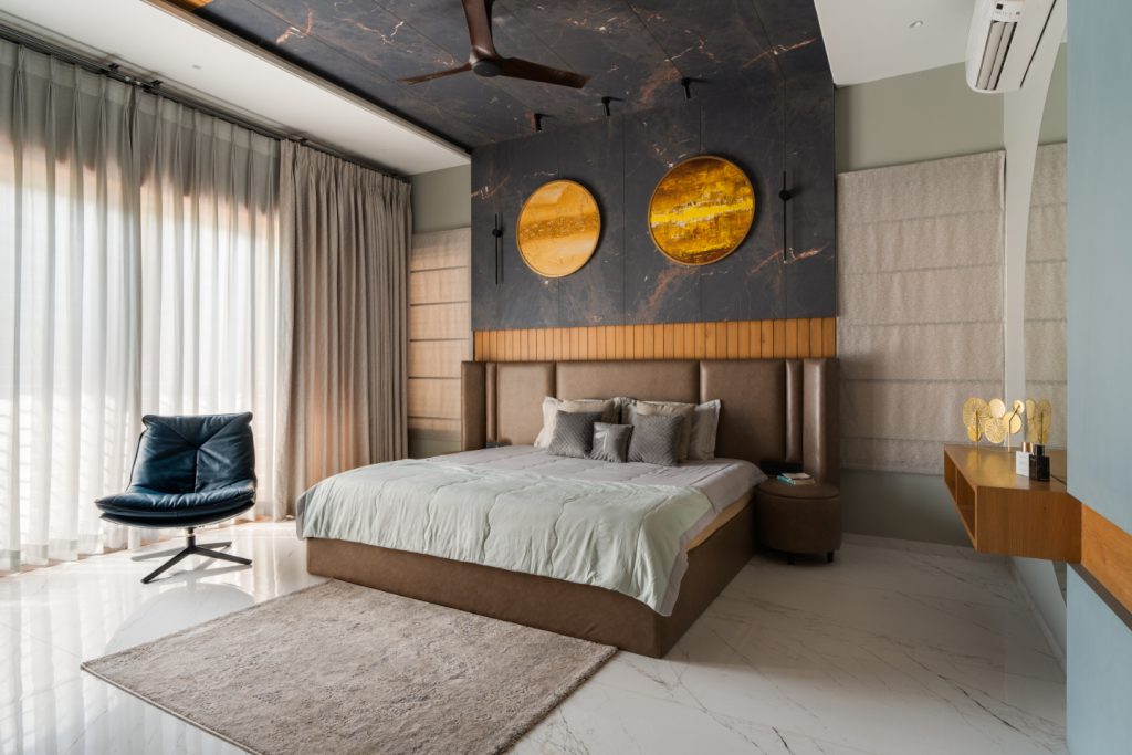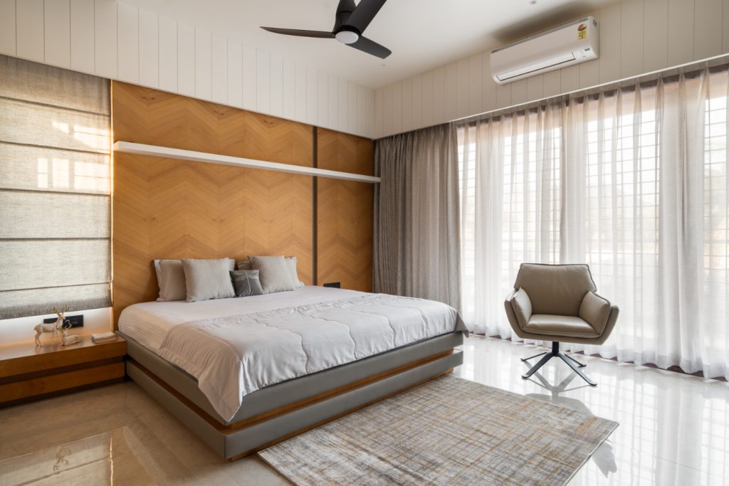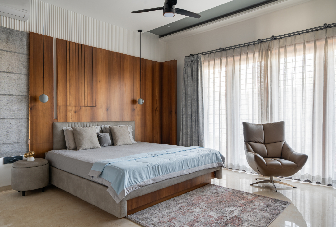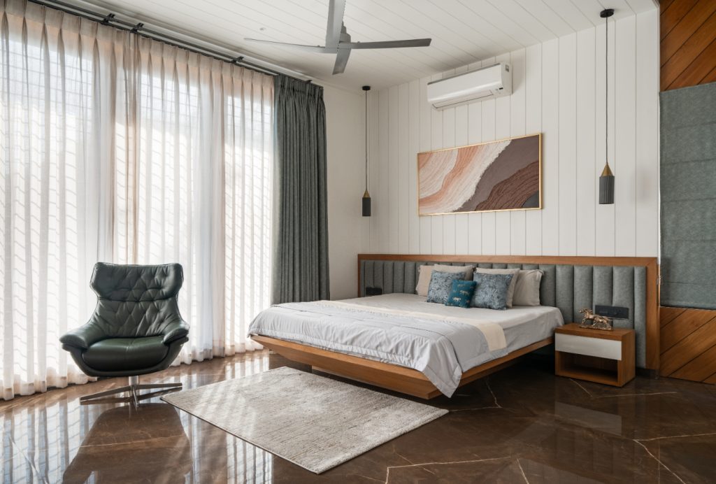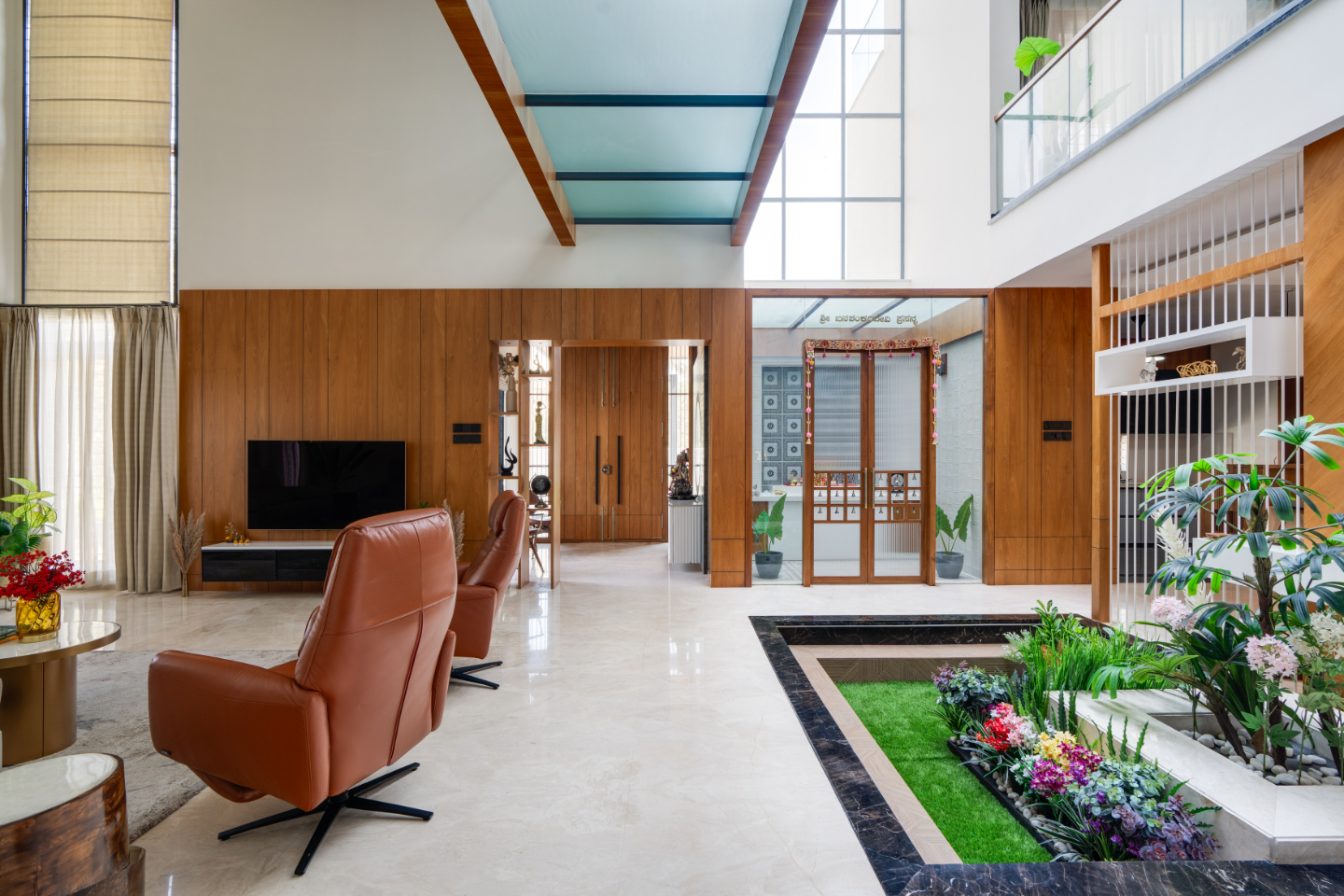 Designed with sustainability in mind, the villa makes full use of passive cooling strategies. Large openings in each room offer visual access to greenery and promote airflow, while shaded sit-outs and landscaped gardens on both the north and south sides extend the living space outdoors.