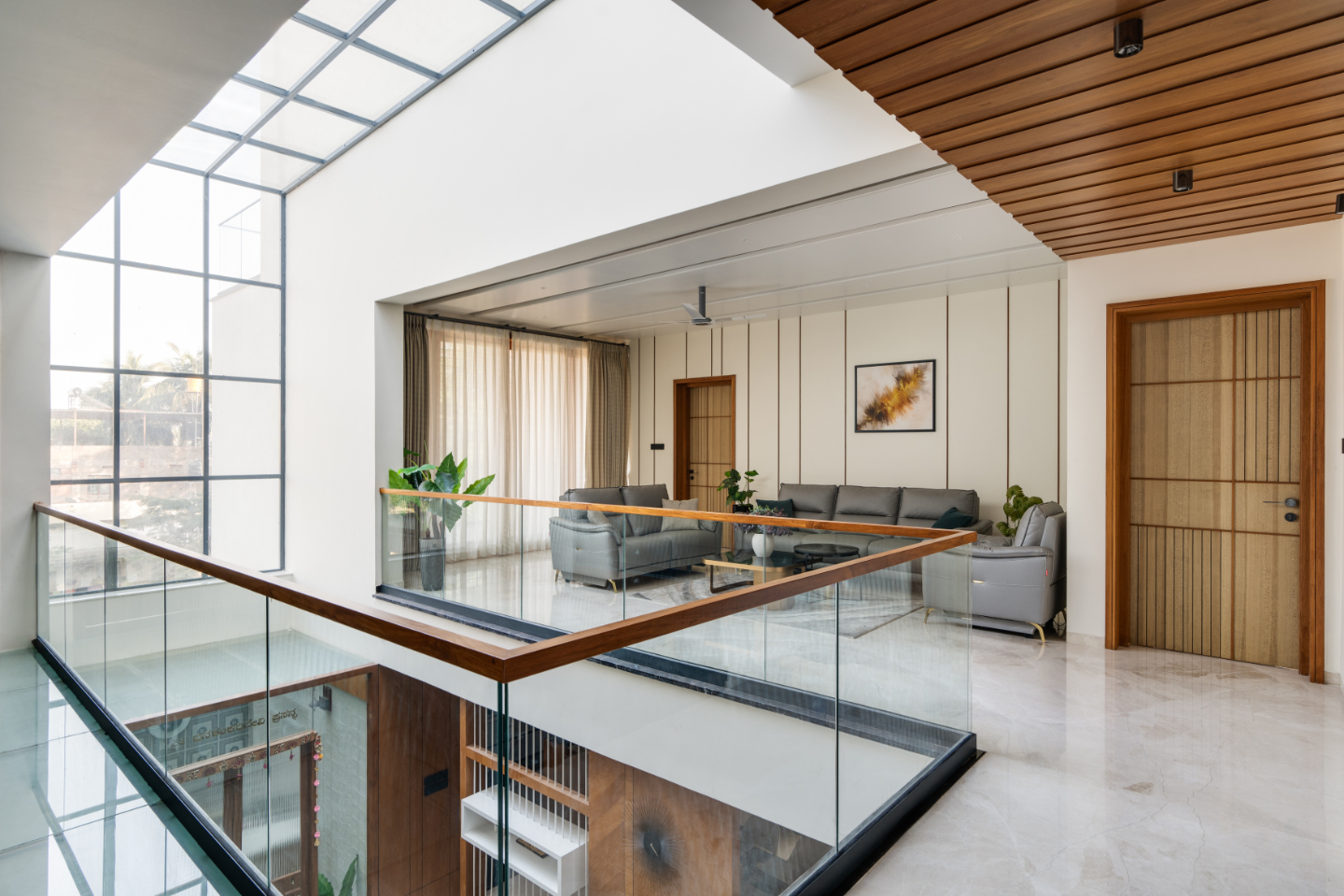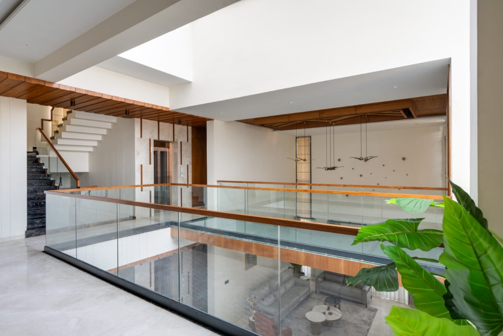 A standout feature here is the glass skylight, which brings soft, diffused light into the circulation areas and echoes the transparent design language established by the glass bridge.