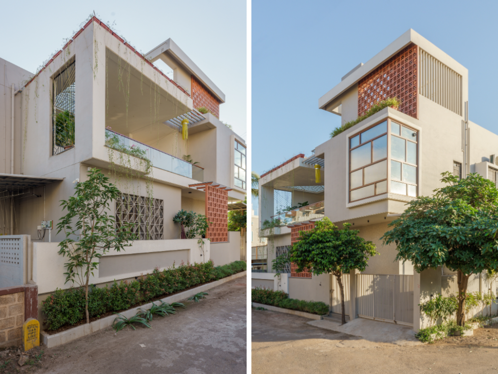 Situated on a rectangular corner plot in the burgeoning core of Sangli city, the residence is an architectural gem. It seamlessly blends contemporary design with thoughtful planning. Measuring 56’8″ x 36’5″, the plot’s orientation towards the north and west posed unique challenges. Particularly the need to accommodate setbacks while optimizing usable space. The entrance, framed by verdant landscaping, creates a composed welcome, while a dedicated parking area is efficiently positioned on one side. Every aspect of the design adheres to Vaastu principles, harmonizing spatial flow and functionality.