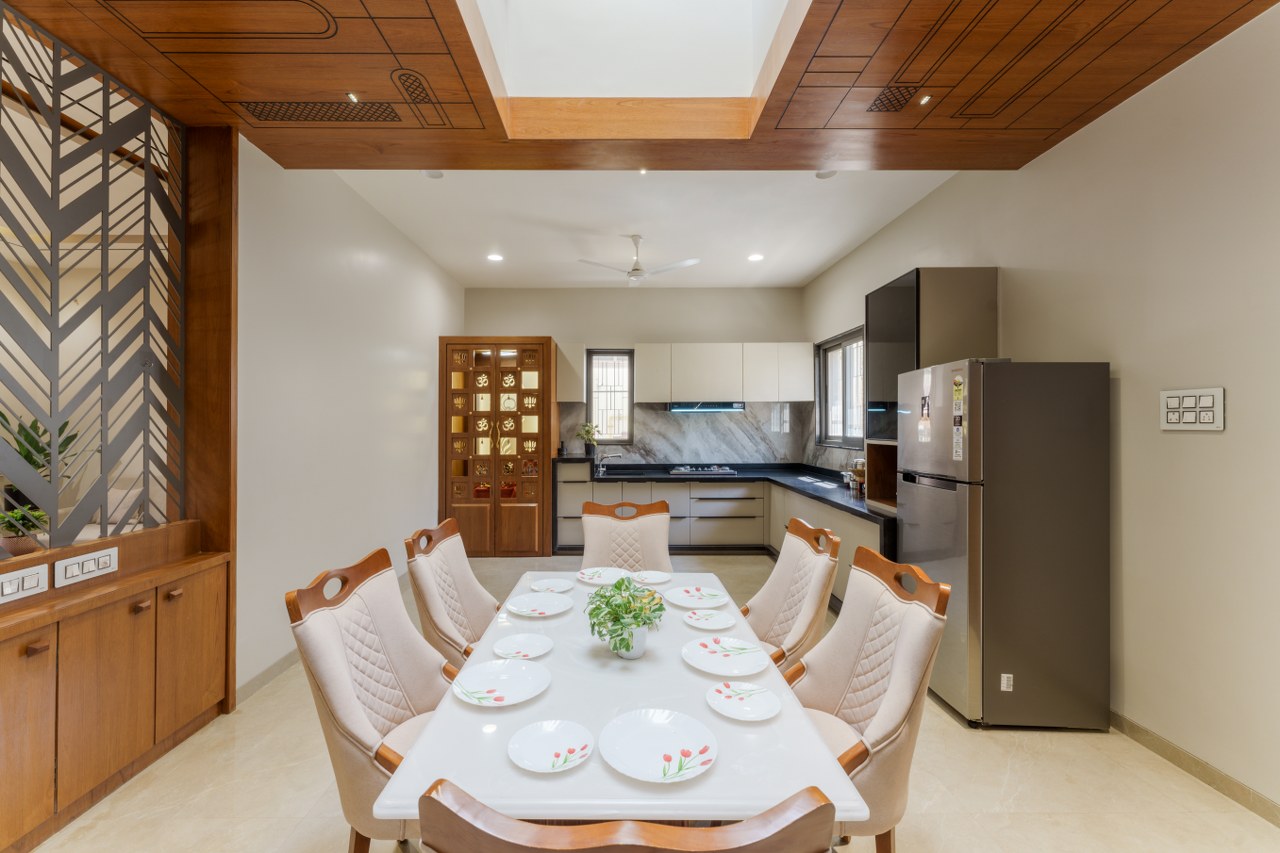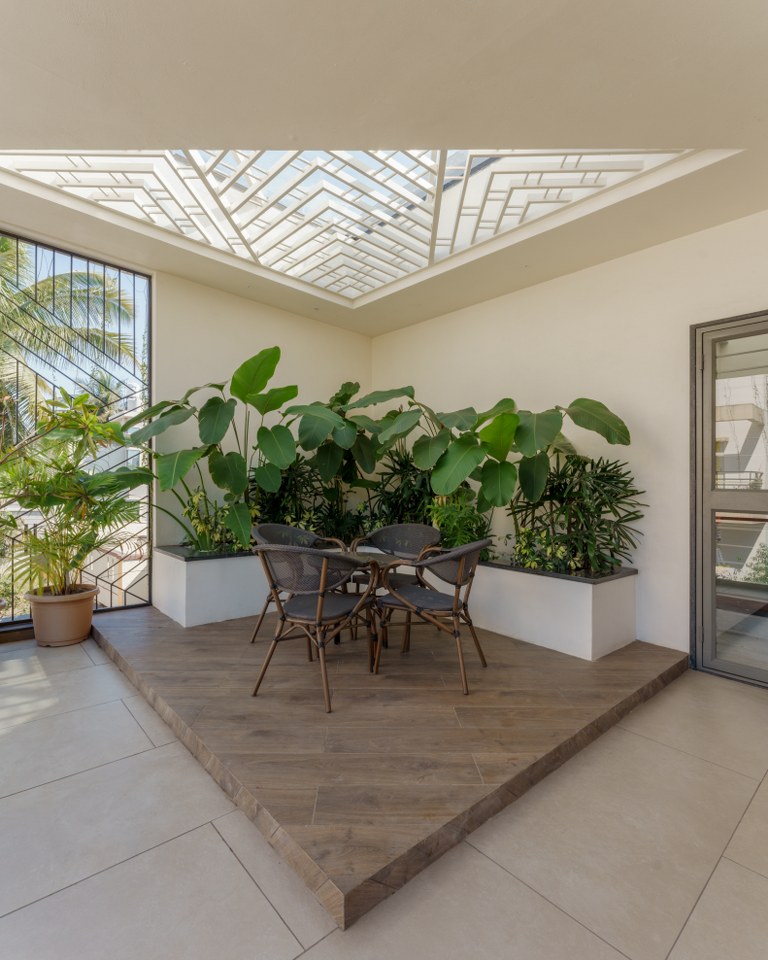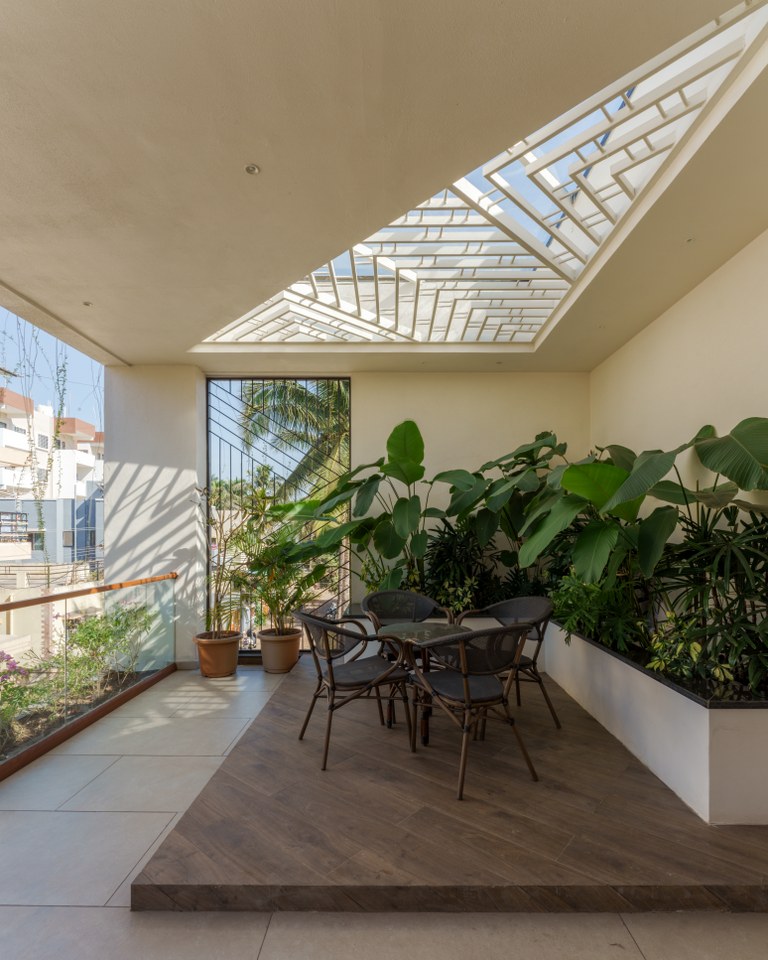 A nearby store room enhances practicality, while the rear setback serves as a utility area. At the heart of the ground floor lies a semi-open dining area, crowned by a skylight cutout from the first floor, stimulating interaction and visual continuity.