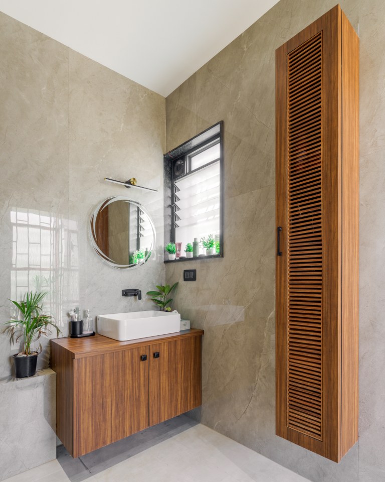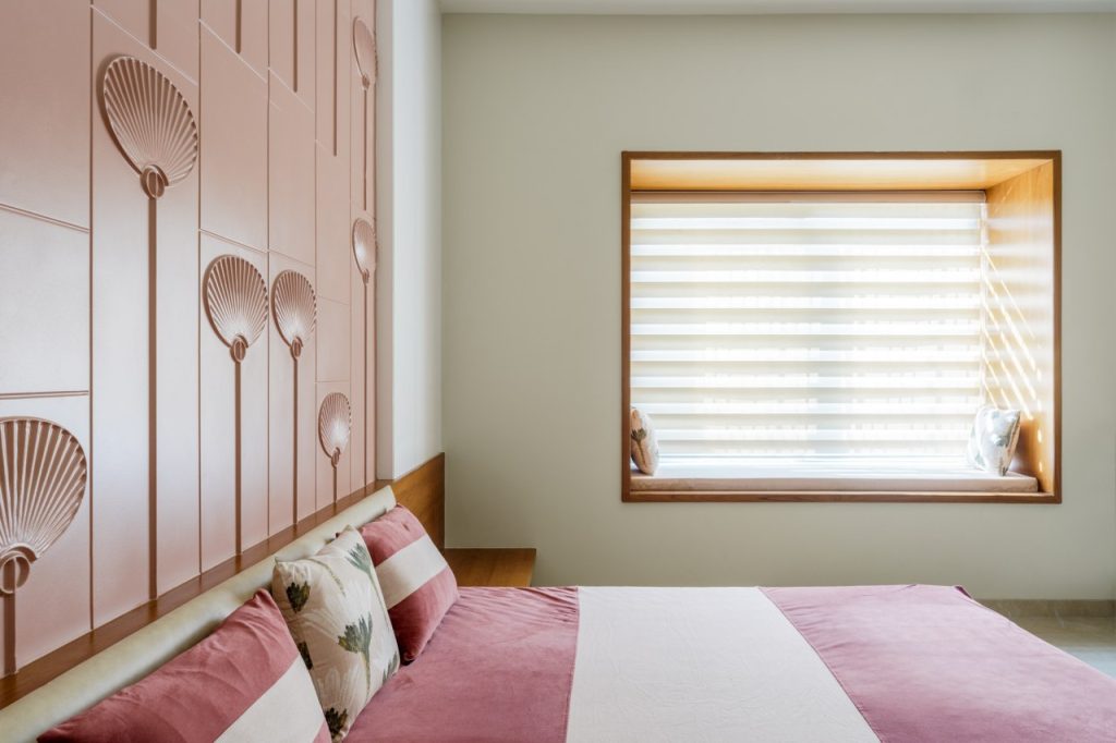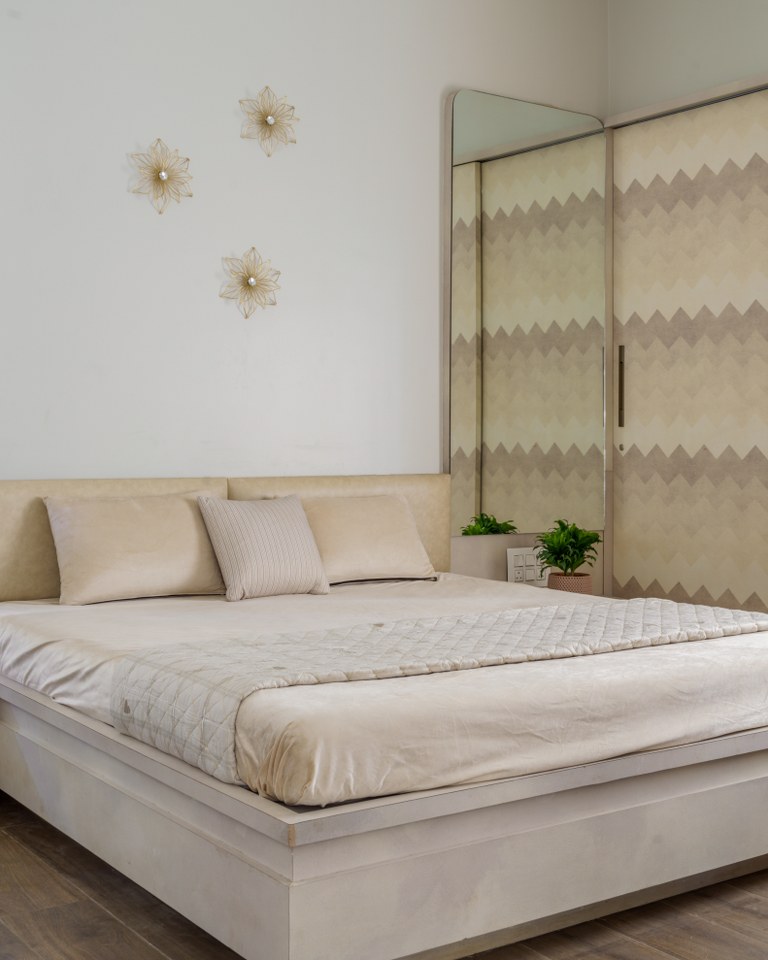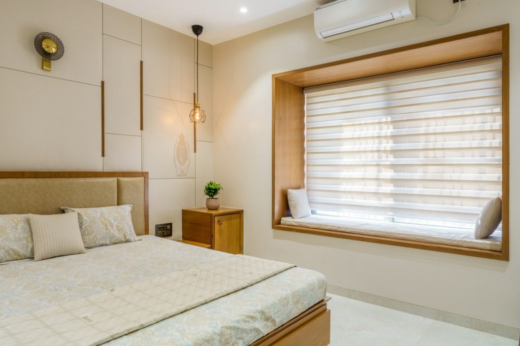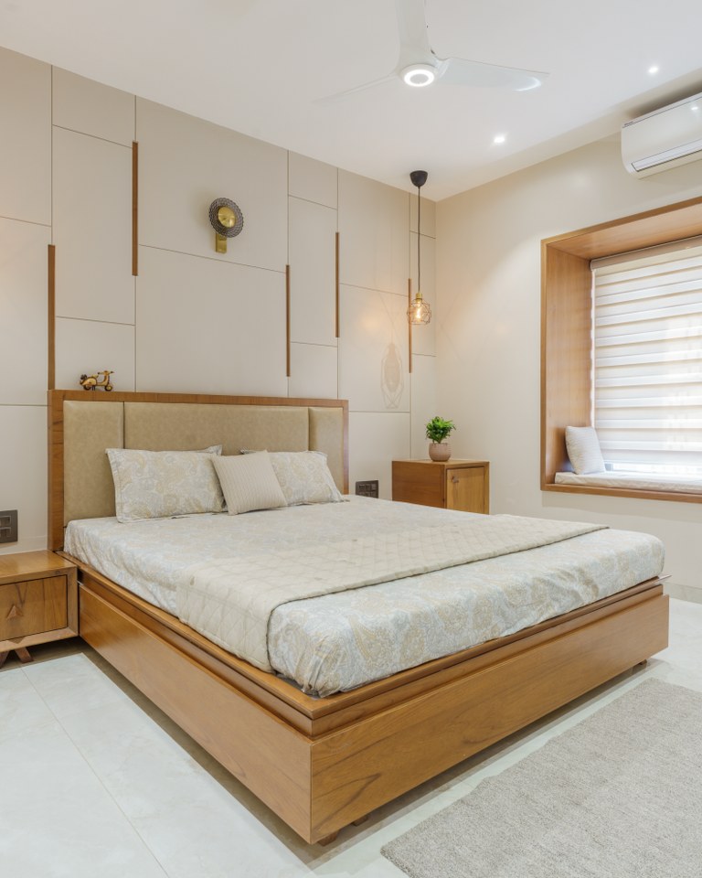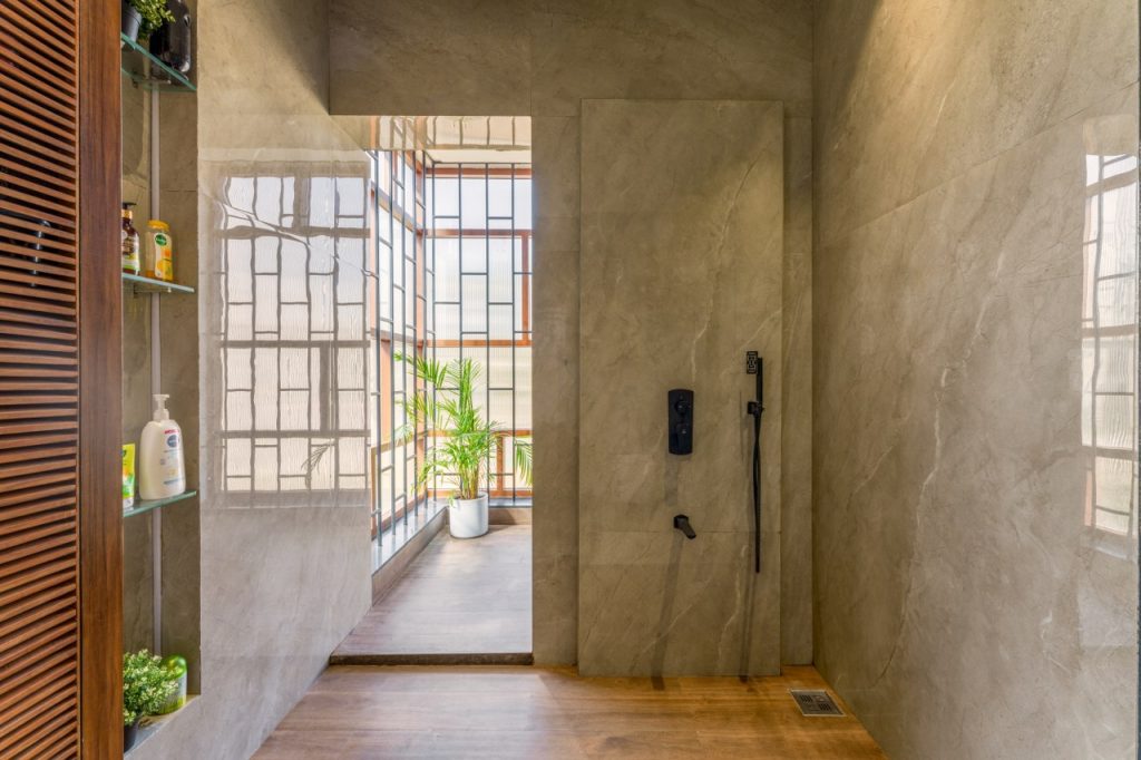 Ingeniously, the staircase headroom doubles as a powder room for guests, showcasing the meticulous utilization of space. The parent’s bedroom offers a walk-in wardrobe, an attached toilet, and a cozy window seat and stands out as a luxurious sanctum.