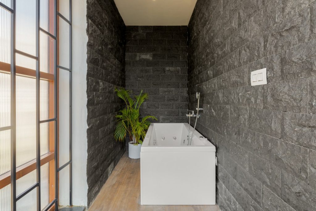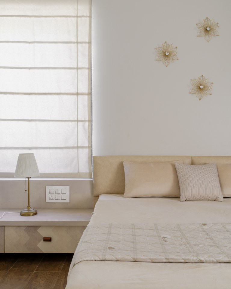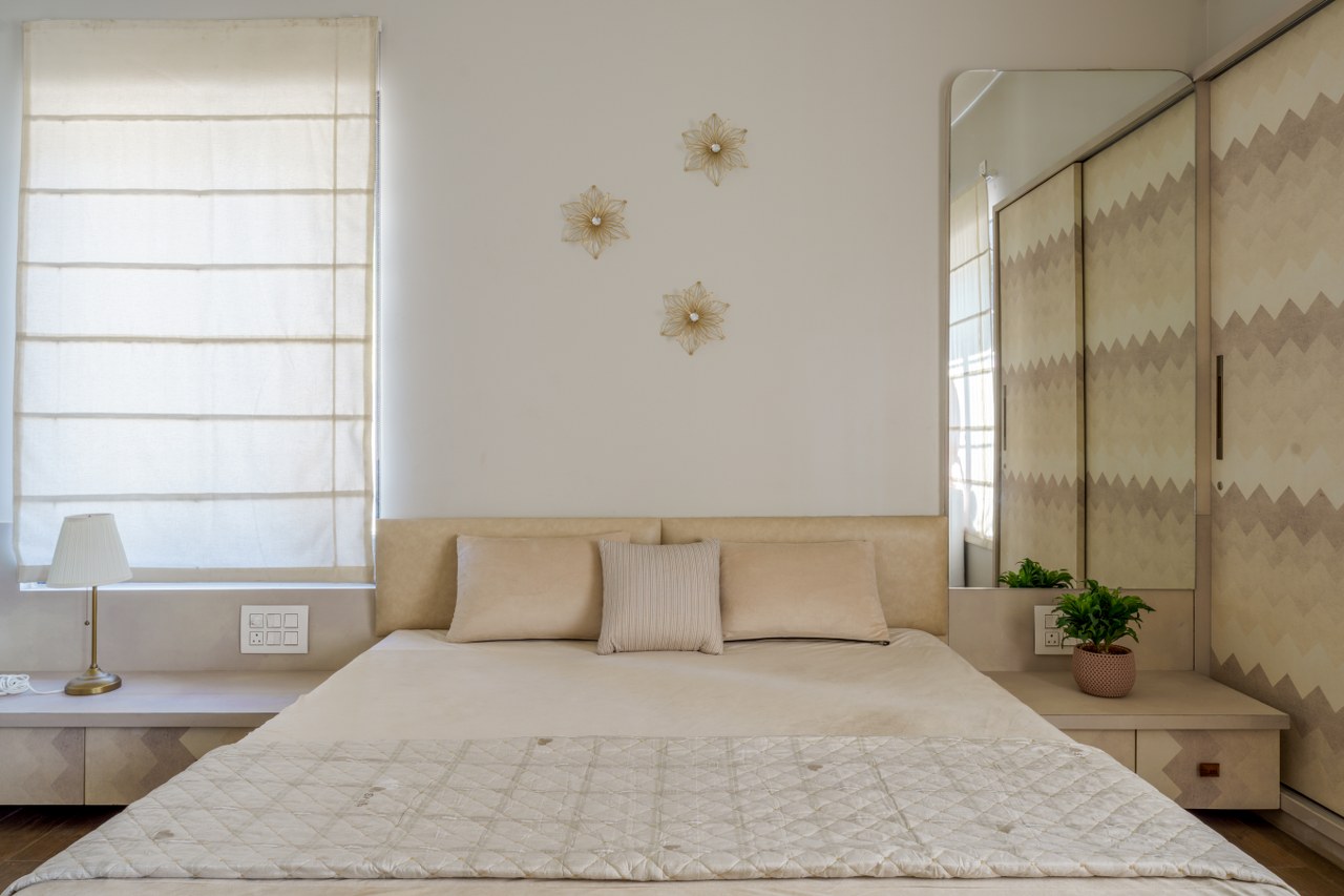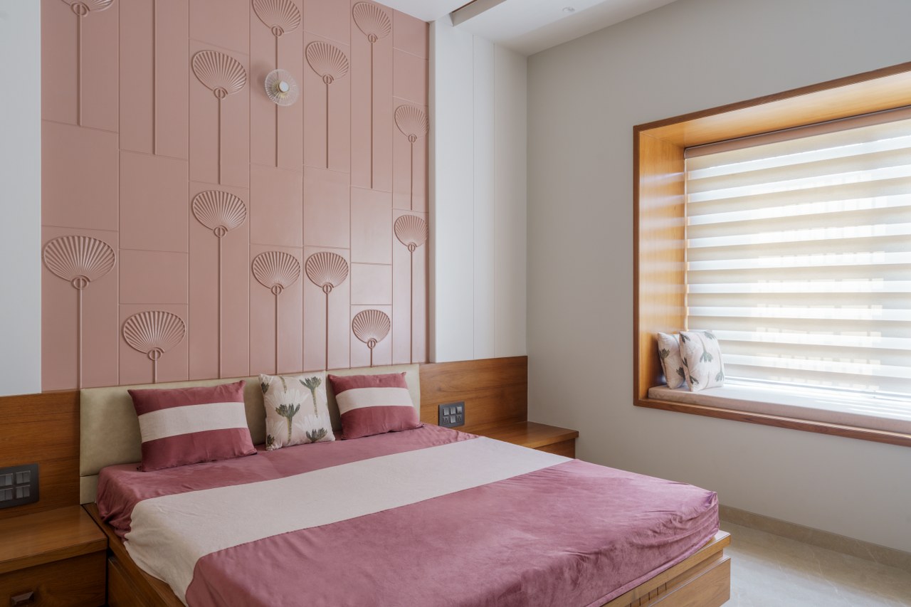 Ingeniously, the staircase headroom doubles as a powder room for guests, showcasing the meticulous utilization of space. The parent’s bedroom offers a walk-in wardrobe, an attached toilet, and a cozy window seat and stands out as a luxurious sanctum.