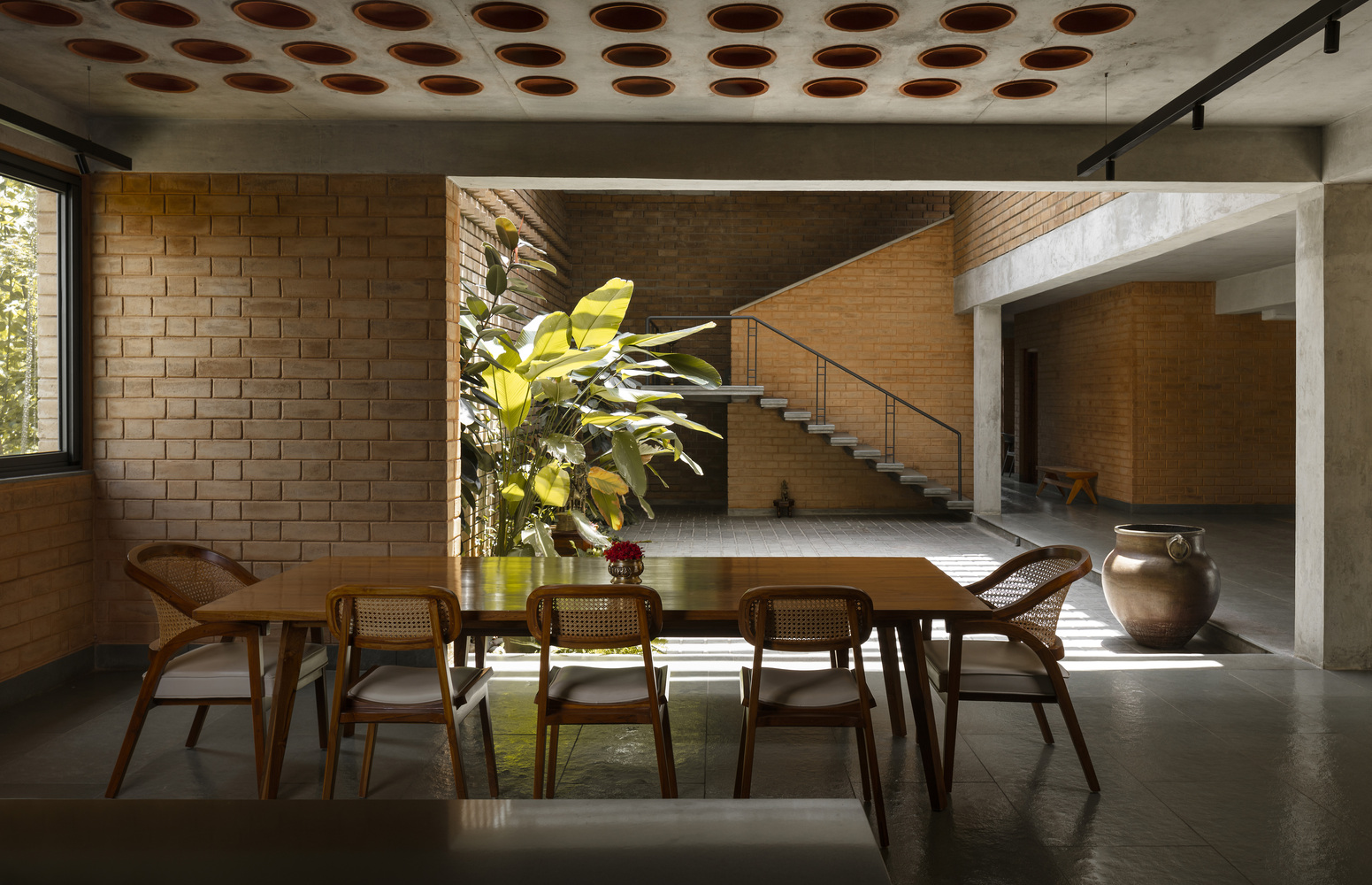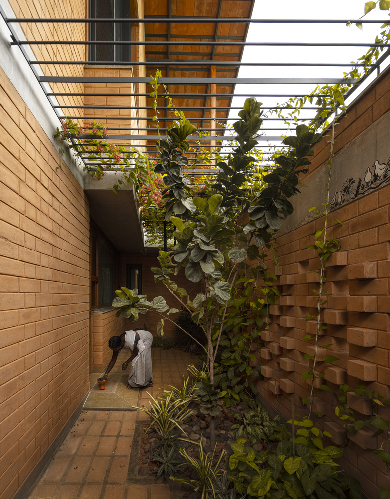 The house is constructed entirely in load-bearing masonry, a deliberate decision that aligns with the family’s appreciation for craft, intricacy, and unembellished material character. Exposed brickwork eliminates the need for plaster or surface treatments, allowing the architectural expression to remain honest and textural. The structure reads as a grounded mass, rising directly from the terrain; the verandah steps extend like roots, while the roofline shelters the spaces much like the canopy of a mature tree.