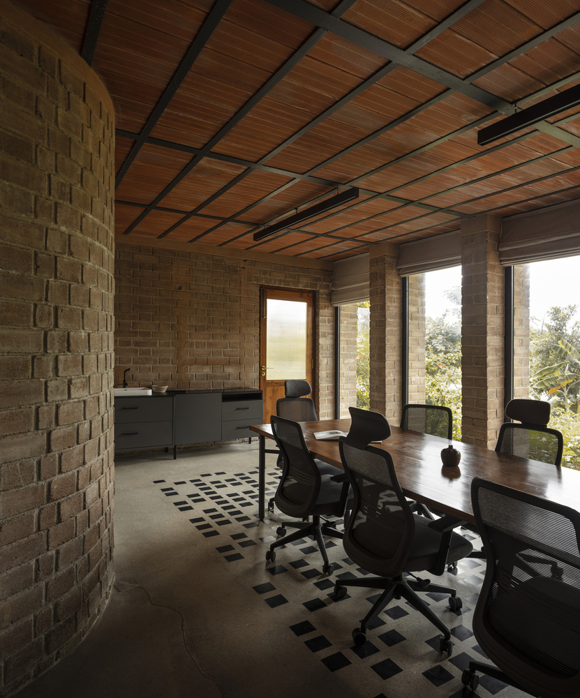Landscape design plays an integral role in defining the project’s identity for slow living. We placed every plant intentionally. We planted the first Champa tree during the home’s conceptual phase, positioned to be visible from the primary bedroom. The one-acre site also accommodates an office for the father and staff residences. These auxiliary structures adopt the same exposed-brick vocabulary. They form a peripheral edge that protects the internal garden and reinforces a cohesive material language.