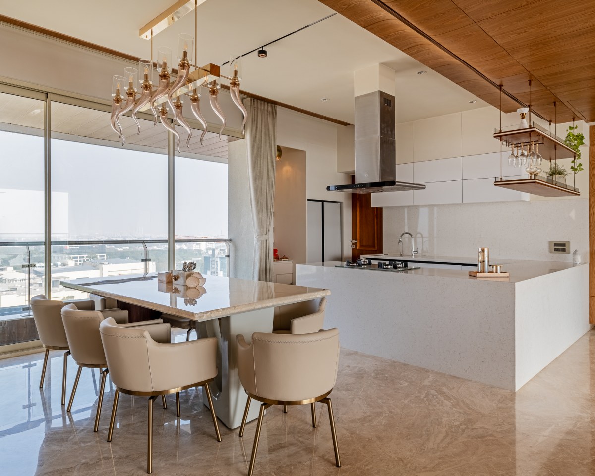 Lighting once again plays a key role here; soft tones, warm pendants and balanced overhead fixtures help create a dining atmosphere suited for both everyday meals and elegant hosting.
