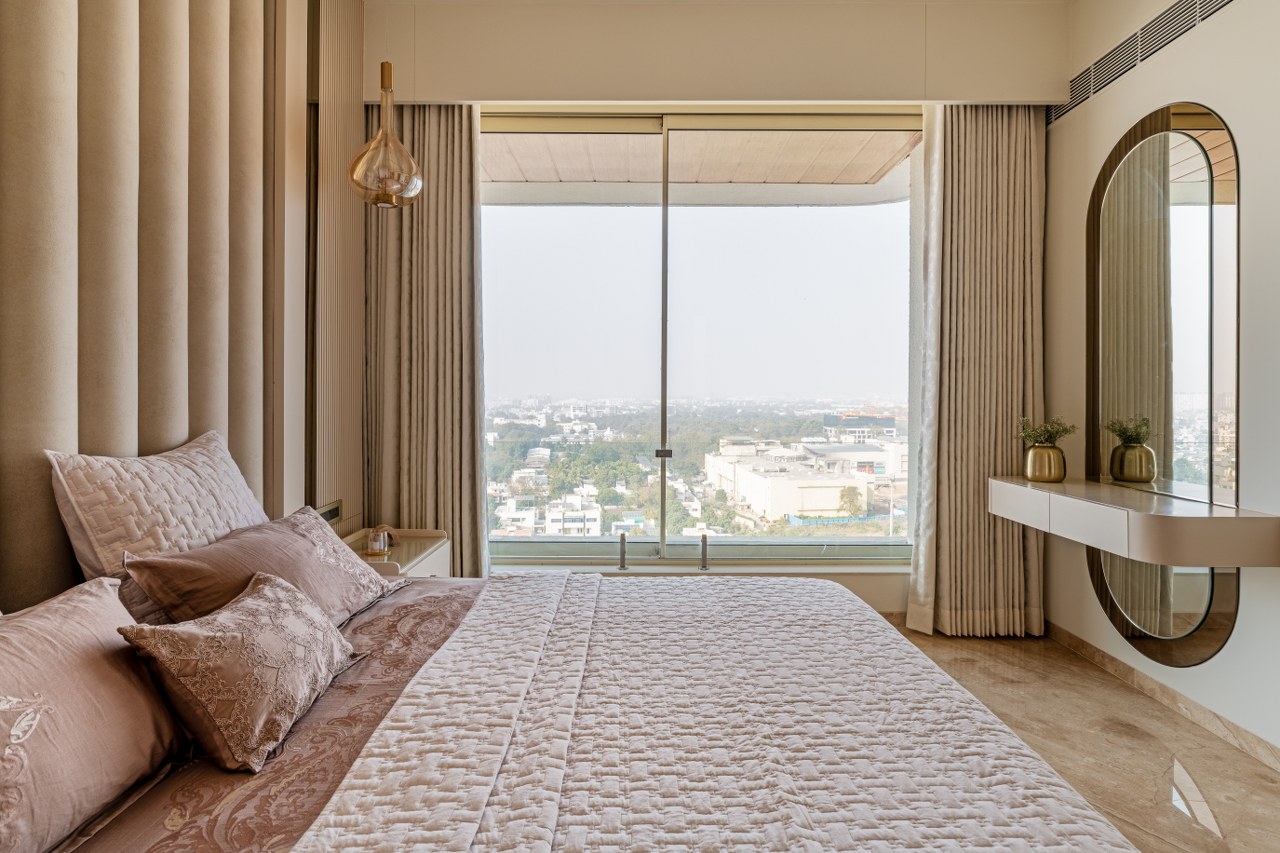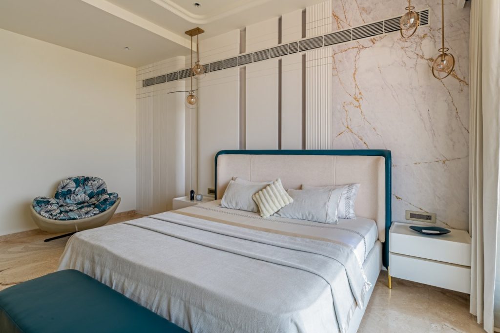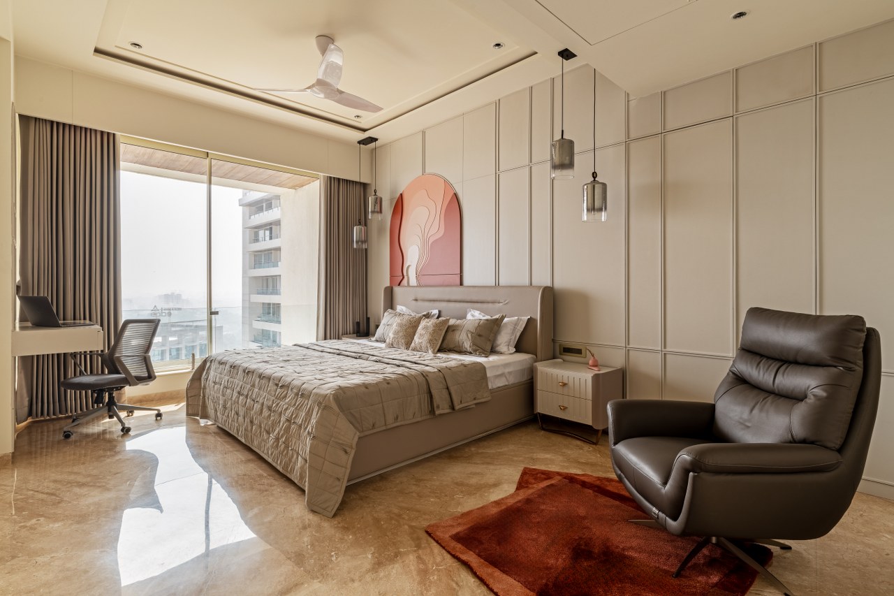 The master bedroom embodies the essence of comfort-driven luxury. Through a neutral palette of soft tones enriched with subtle textures, the space exudes tranquility. The design avoids visual clutter, opting instead for structured layouts and soft materials.