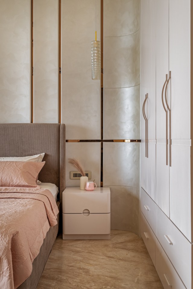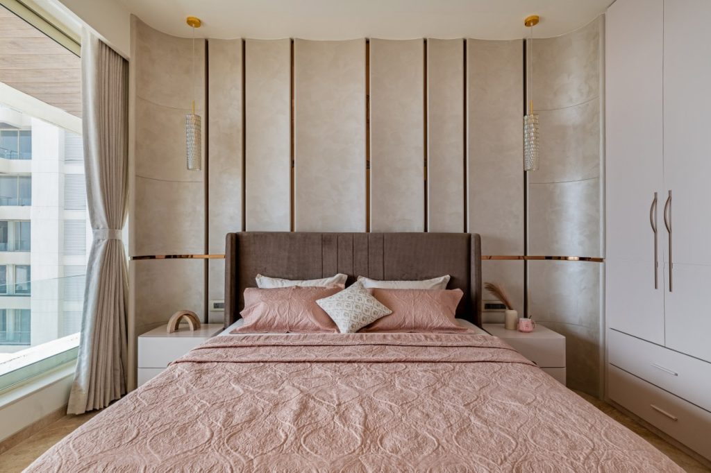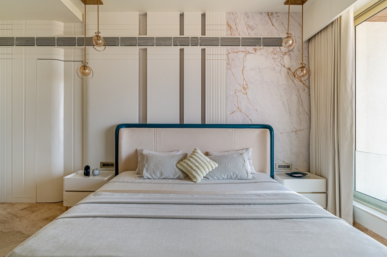 The headboard wall is the visual anchor of the room—designed with layered paneling and fabric inserts to create a warm, cocoon-like environment. The integration of functional storage, ambient lighting, and carefully selected décor elements ensures that the space remains restful yet refined.