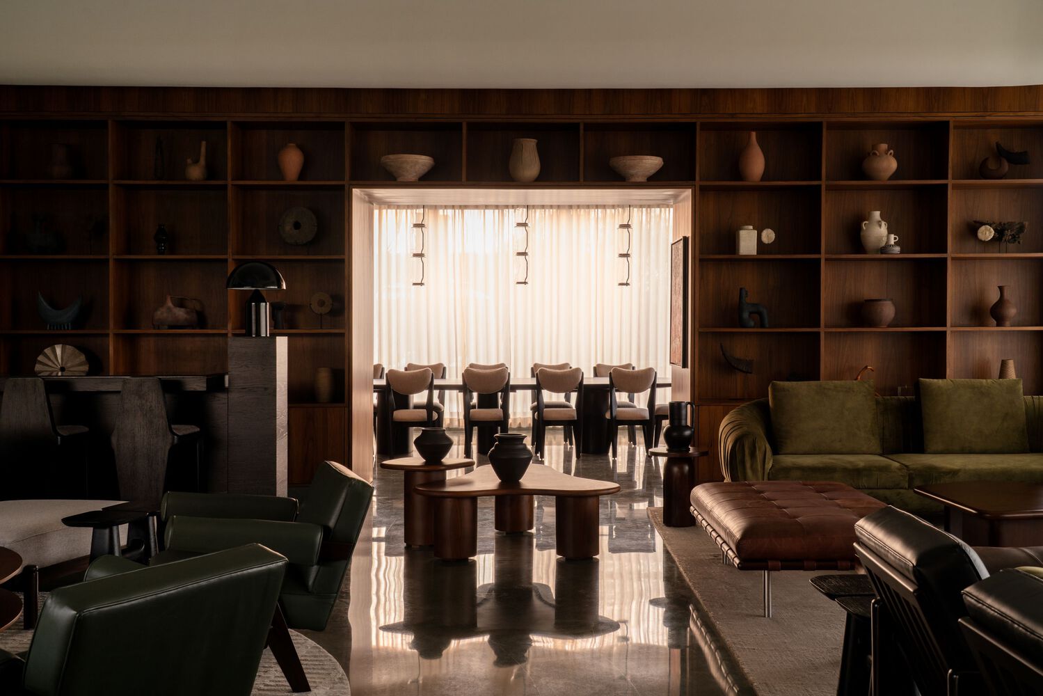 The restraint in articulation is deliberate. The heavy mass of brick walls set against hovering concrete slabs creates a play of solidity and levity. It anchors the house into the earth while simultaneously opening it to the sky. Inside, the interiors bring in a sense of refined warmth. A mid-century modern aesthetic of tactile woods, low-slung leather seating, and clean-lined furniture contrasts yet complements the rawness of the exterior. This duality of rough and smooth, hard and soft, monumental and intimate gives The Sanctum sitting on a 3 acres land is a distinctive emotional charge.