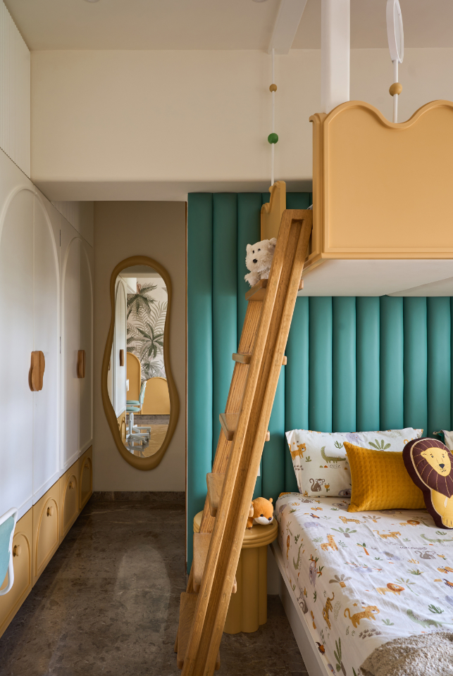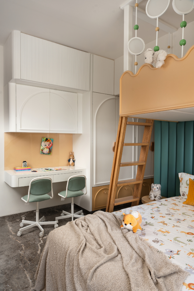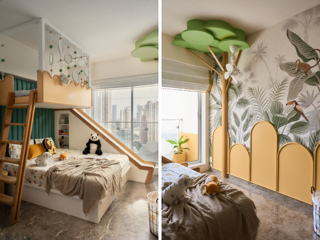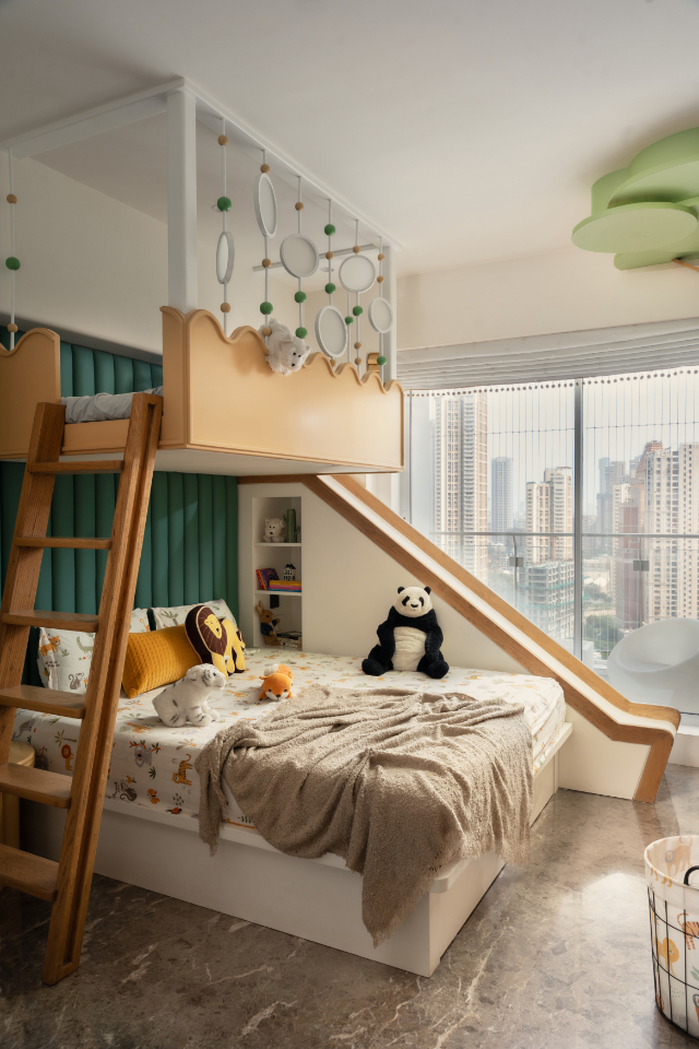 The kids’ bedroom unfolds as a world of imagination. It is a gentle departure from the home’s refined calm into a realm of play, discovery, and joy. Drawing from a jungle theme, a lively wallpaper of foliage and animals animates the wall opposite the bed. It infuses the space with a sense of adventure. The palette dances between cheerful yellows and fresh greens, echoing the vibrancy of childhood. Above the bed, a mezzanine becomes the children’s private world. It is a playful nook accessed by a wooden ladder and exited through a slide that arcs gracefully into the room. Mezzanine’s railing, dotted with colorful spheres and pivoting rings, turns safety into an interactive design feature. Beneath the slide, clever storage for books doubles as a side table, ensuring every inch serves both play and practicality.