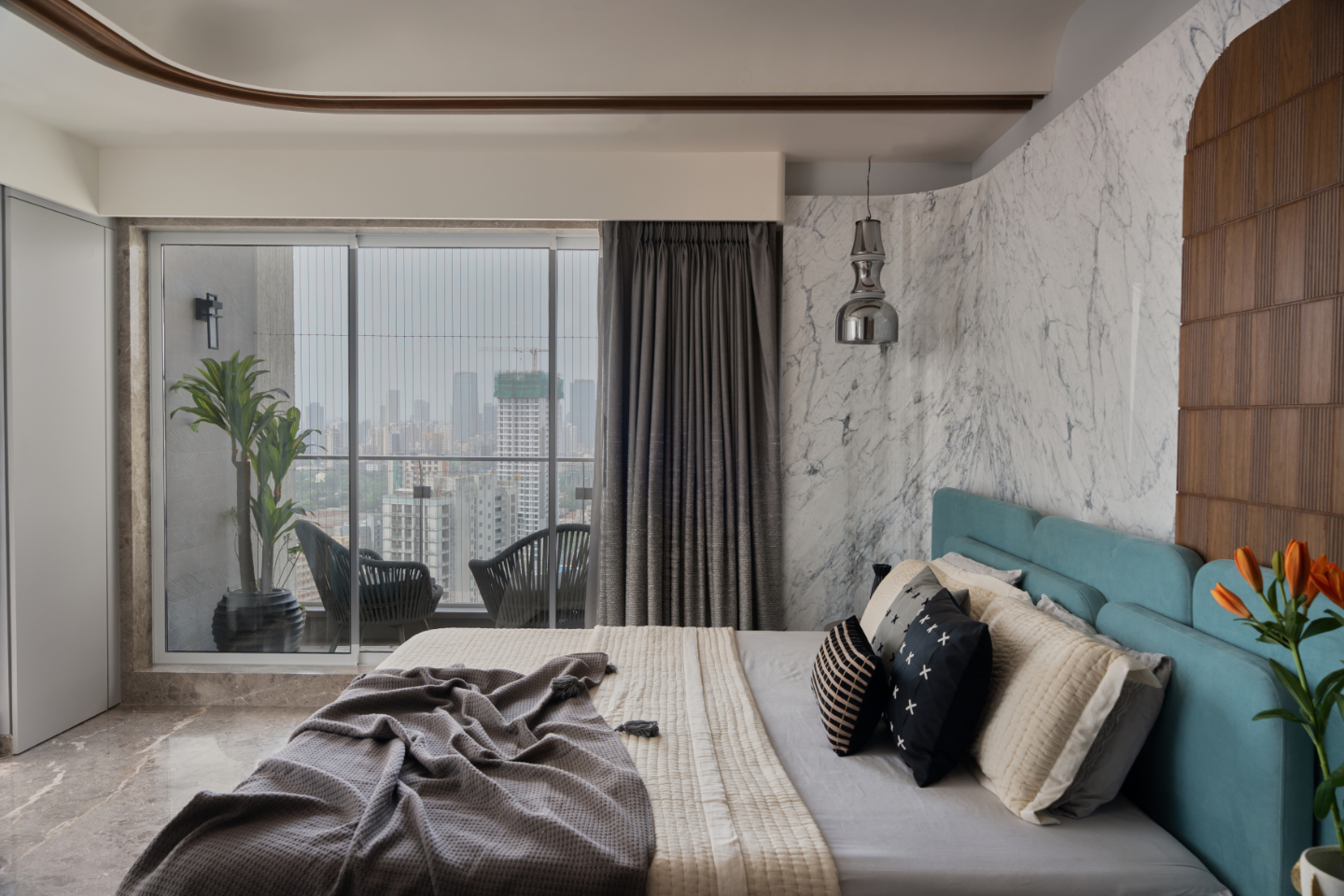 A powder-blue headboard anchors the space, evoking a sense of poise and serenity. Marble finishes lend understated luxury, while natural light enhances the tactile quality of the fabrics and veneers. The adjoining balcony offers a contemplative pause — an urban veranda of sorts, framing the city yet keeping its chaos at bay.