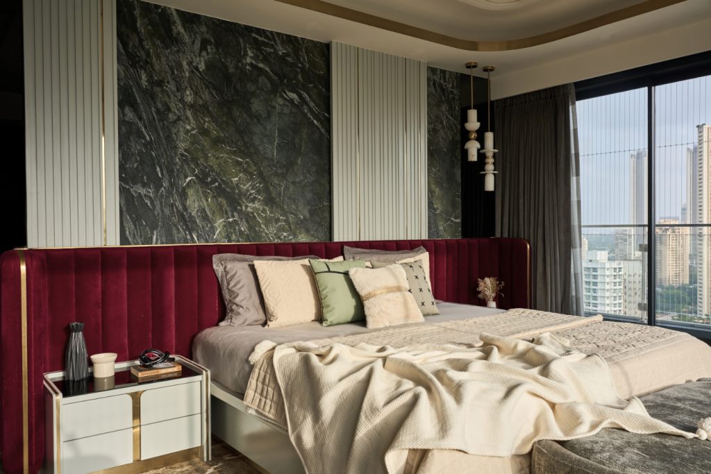 This room speaks of individuality — a composition where strong tones, textures, and materials coexist harmoniously. The palette is mature yet indulgent — a reflection of the occupant’s mid-age sensibility and penchant for refinement. The space celebrates tactility — the lushness of velvet, the rawness of marble, the structure of ribbed surfaces, and the golden glint of metal trims. It’s luxurious without being loud, expressive without losing sophistication. The city views beyond the windows complete the frame — grounding the room’s elegance in the urban context.
