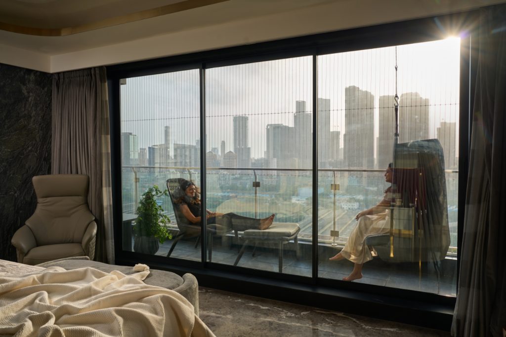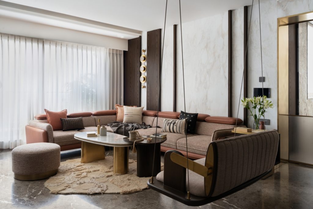 The home opens up seamlessly into its living and dining spaces—an expansive, light-filled volume that feels grounded despite its urban altitude. Here, the palette whispers rather than shouts: soft blush, warm taupe, ivory, and the faint glint of metal. The furniture, with its sculptural silhouettes and plush tactility, offers balance between visual calm and physical comfort. A swing—playful yet poised—anchors the space as a nostalgic gesture reimagined for modern sensibilities.