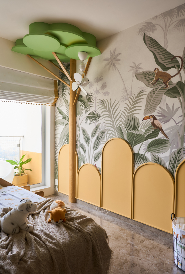 Completing the scene is a whimsical, handcrafted tree that anchors the jungle-themed wall. It is a sculptural installation that blurs the line between art and architecture.
