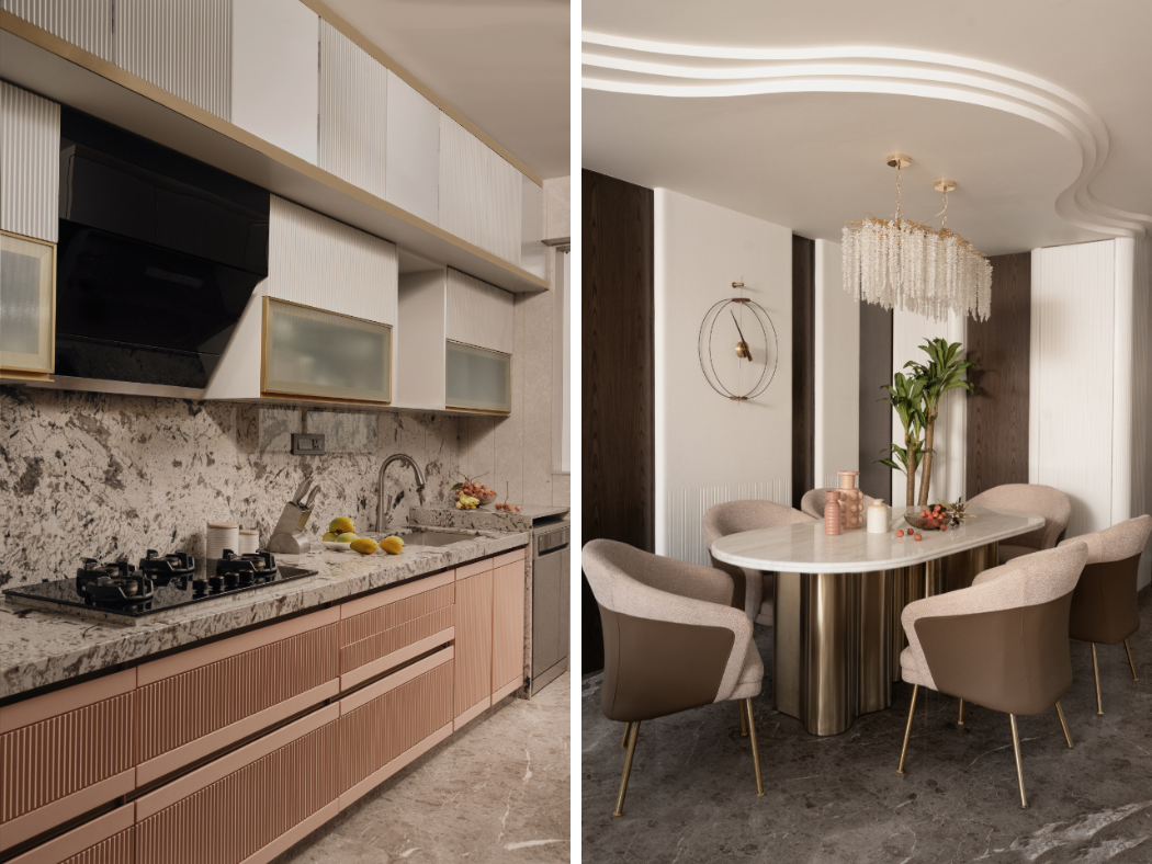 Extending from this sculptural living zone is the dining area — an elegant continuation of the home’s fluid geometry. A contoured ceiling crowns the space, drawing the eye upward to a statement chandelier that glows like suspended jewellery, adding quiet drama to the room. Below it sits a bespoke six-seater dining table, its marble top softened with rounded edges and poised upon a custom matte-gold metal base that ripples in an almost amoebic form. The fluidity of this base mirrors the rhythm of the adjoining ripple wall, creating a dialogue between movement and stillness. Upholstered dining chairs with slender metal legs offer both comfort and poise, while a flush storage unit along the dining wall blends form with function — its seamless shutters maintaining the visual calm of the setting. Together, this attention to detail lend the dining space a sense of effortless luxury — vibrant, composed, and distinctly tailored.