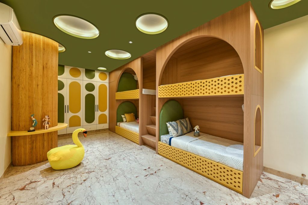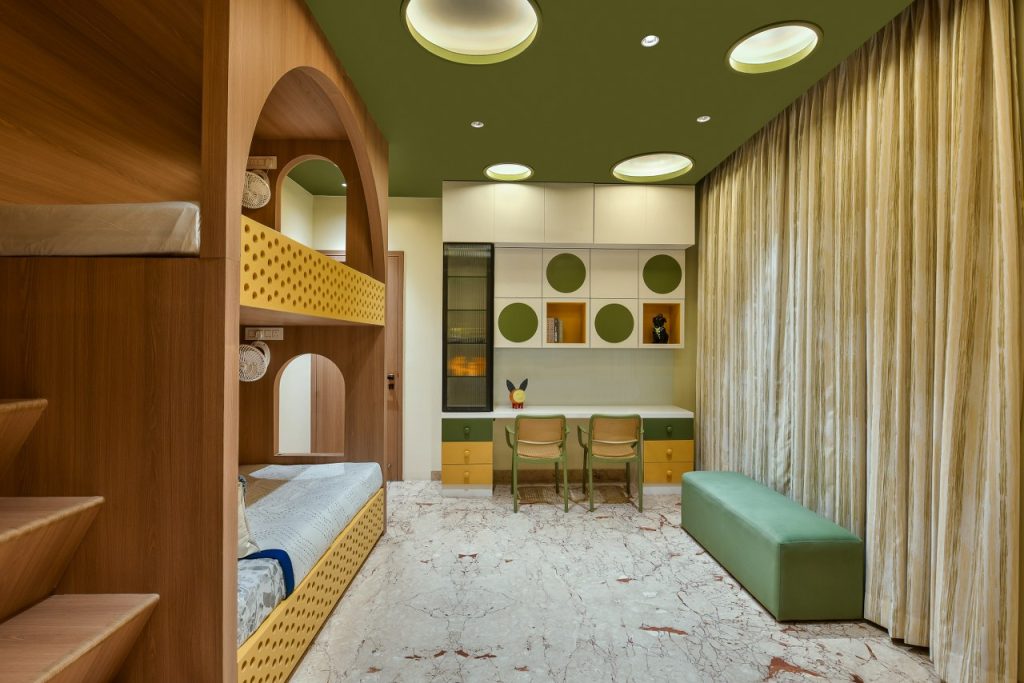 Uniquely crafted, the bunk beds in the kids’ room feature circles and arcs cut-out in warm timber– playful elements and balanced aesthetics uplifted by bright colors in the shades of green and yellow, supporting children’s curiosity and playfulness.