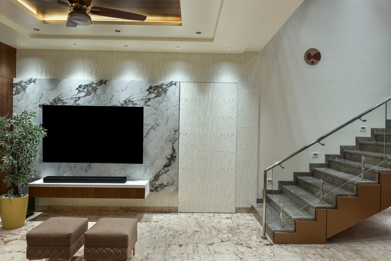 Taking the first step towards the entrance, one tends to be awestruck by the living area- a luxurious ambience emerging out of marble cladded TV wall over a grooved MDF panel finished in white PU and a frosted mirror backdrop. The space also complements the drawing room clad with a panel merging beige laminate and rose gold mirrors. The staircase with its grey veiny stone elevates the opulence of the floor along with the wall featuring incredible murals.