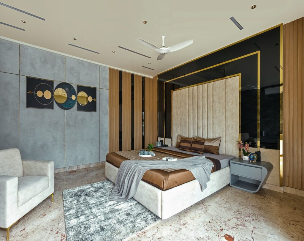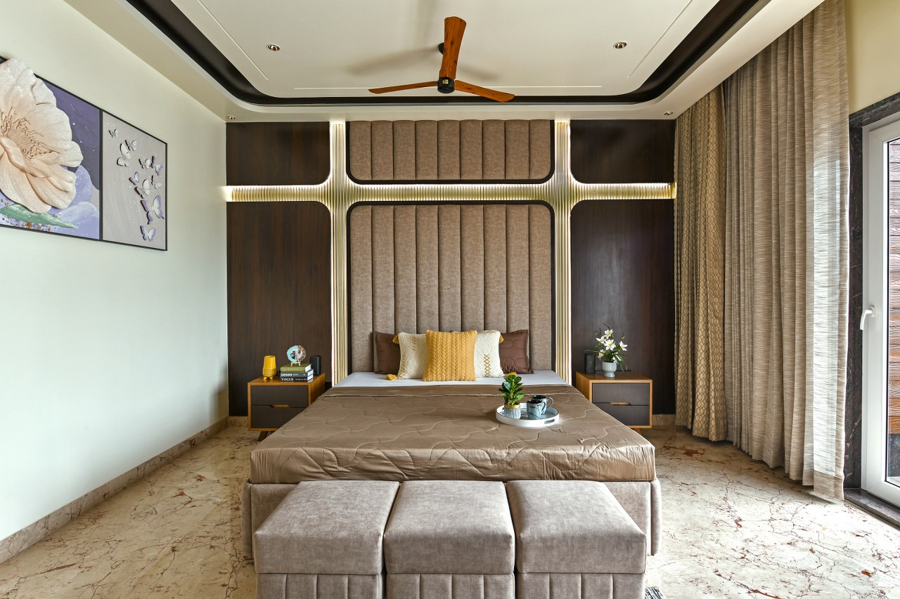 A corridor leads to the two bedrooms—each a distinct symbol of enhanced comfort and luxury. In the first suite, a sense of grandeur is achieved through an upholstered headboard and a metallic color palette. A concealed door within a walk-in wardrobe bestows a dramatic provision for organizing clothes.