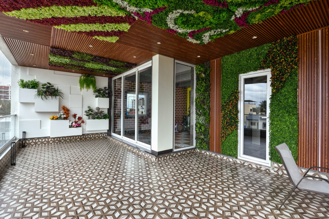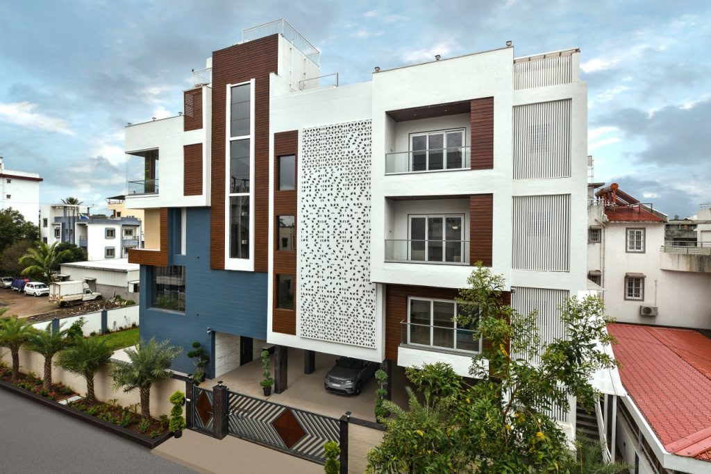 Standing strong on a long, narrow plot, Baldota House lays its first brick at the street-facing garden that softens the junction between public and private zones. A melody of plants unfolds beneath a custom-cut GRC screen that doubles as an elegant façade, filtering morning light in patterns across the marble plaza. This verdant beginning sets the tone for the meaningful design and balanced aesthetics that follows: each balcony serves the roles of both buffer and bridge bringing the cool breeze inside.