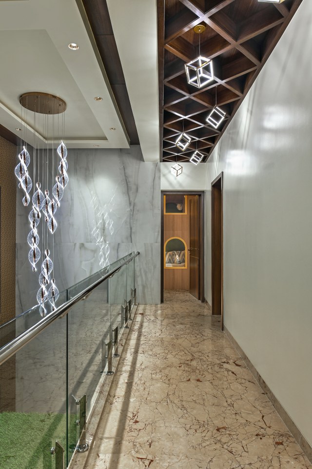 Products / Materials / Vendors: Finishes – Marble, Texture Paint, Ready Wall Panels, Veneer, Laminates, Tinted Mirror / Wallcovering / Cladding – Exterior Fibre Cement Boards (Wooden & Plain), Texture Paint, Custom Designed Backlit Grill/Jaali  / Construction Materials – RCC Framed Structure / Lighting – Philips LED Lights / Doors and Partitions – Custom Made / Sanitaryware – Jaquar, Kohler / Windows – Aluminium Sections / Furniture – Custom Made, Imported / Flooring – Natural Marble, Kajaria Tiles, Simpolo Tiles / Kitchen – Modular / Paint – Asian PaintsArtefacts – Imported / Wallpaper – Imported Hardware – Hafele, Ebco, Labacha