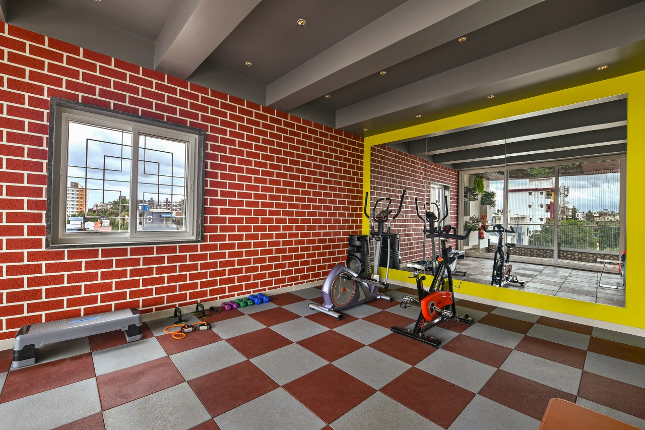 The gymnasium planned with an industrial angle, features exposed brick walls and polished concrete floors. A surprising element of refinement fills the space with pendant lights that catches one’s attention in no time.