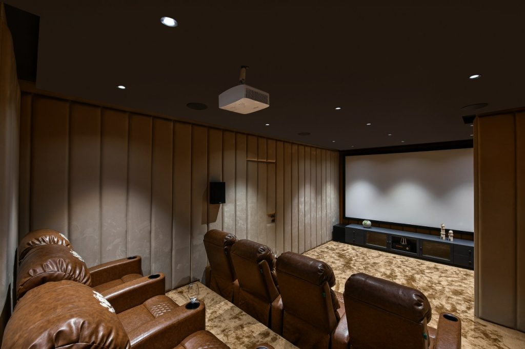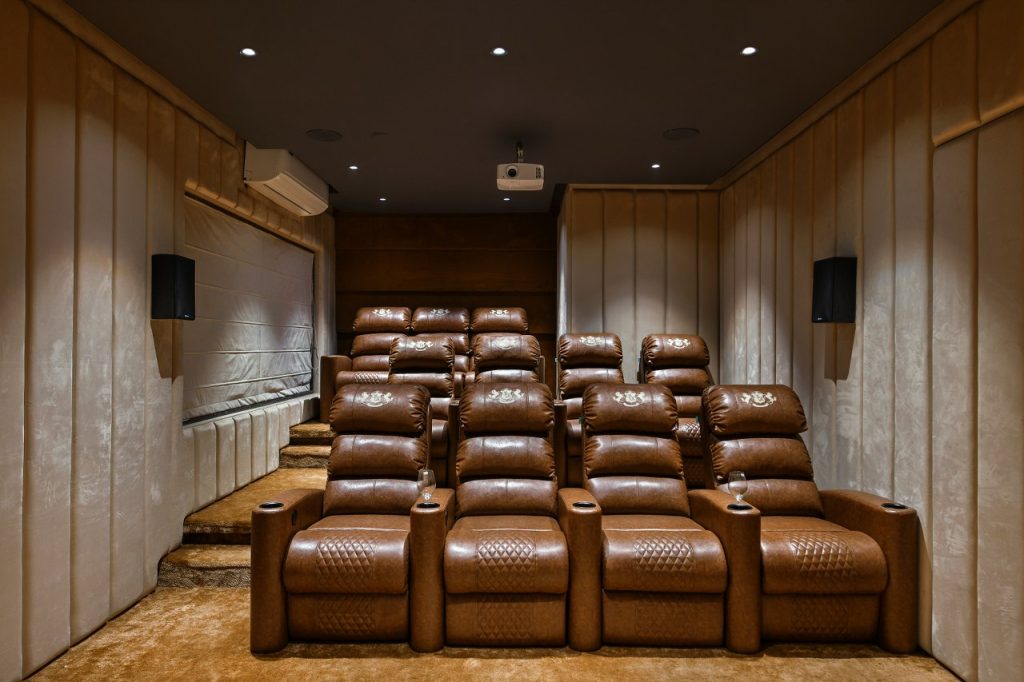 The third floor also accommodates a home theatre— a space designed to entertain in a comforting environment. Plush leather recliners, embossed with the Baldota monogram on stepped platforms for perfect views. Allowing the ceiling to drown in ambient glow, the discreet LED ring lighting mimics the starry night.