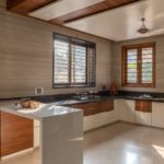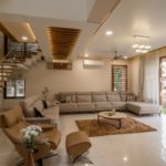 It’s a contemporary cubic house designed by II TVAKSHATI ARCHITECTS II amidst urban vicinity in Surat with timeless architecture and interiors. This cubic house is dominated with three boxes fit within each other very artistically, leaving the voids acting as positive see-through spaces supported by material pallet comprising of stone, wood, stone concrete and glass. The play of planes, solids, and voids is the most striking beauty of the villa making it very stylish and elegant in visual appeal due the apt material pallet defined. The cubicles are slided very tactfully over each other keeping space for skylights and open to skylight well. The exterior and interior sinks into each other to achieve the feel and character of the space. Designer being very trendy in its taste has explored its concept based on the raw earthy feel of traditional Indian designs fusing together with a contemporary and classic theme. It renders a soothing artistic effect to the entire interior setting giving a thematic touch to the designed architectural spaces. Its designed with an open living concept and most spacious spaces which have been kept very gentle and modern casting an enigmatic effect!!!!