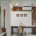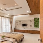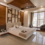 Designer being very trendy in its taste has tried its interior concept based on it. The raw earthy feel of traditional Indian designs which predominantly include paisley leaves, flowers, and creepers design, geometrical shapes render a soothing artistic effect to the entire interior setting an enigmatic effect. The overall design had to be very gentle. Donned in wooden flooring on the right side acts as a youth full sitting space for the couple. This room has a line of full-length wardrobes with spotlights.