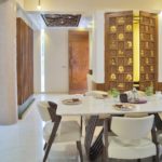 Firstly when one enters the foyer, one will get mesmerized with the intricately designed ceiling and partition which acts as a screen defining the arrival to the foyer area. It is aptly designed with a sculpture niche adorned with meditating Buddha and playful ceiling with most eye-catching lights.