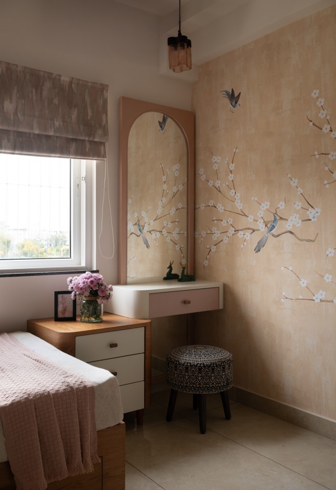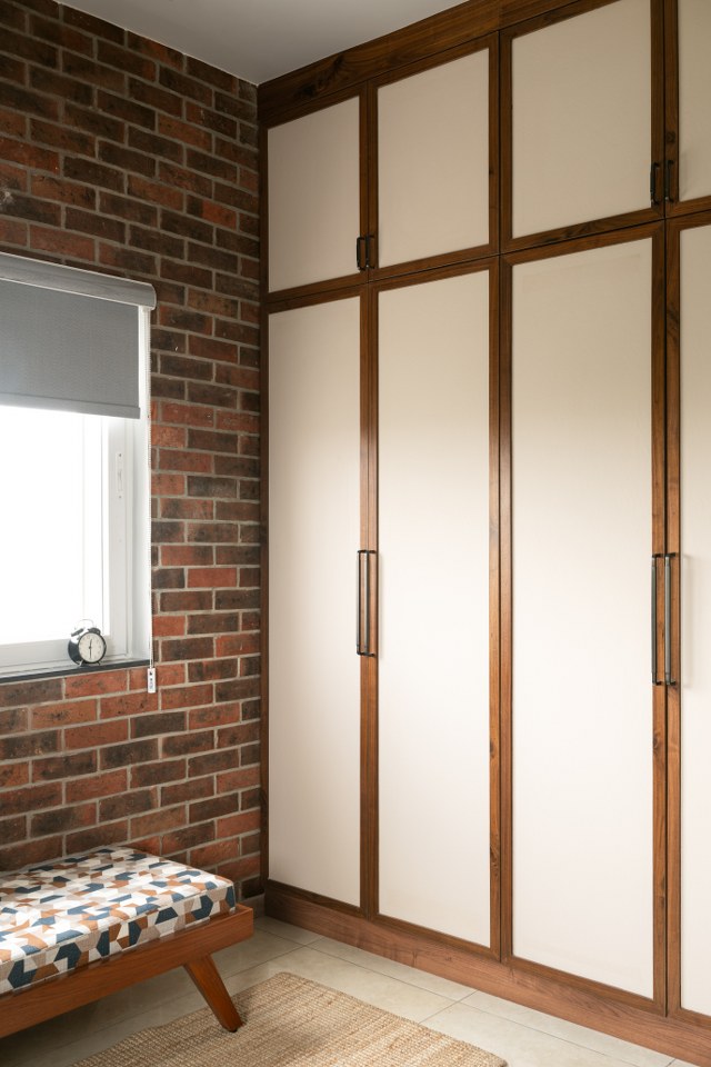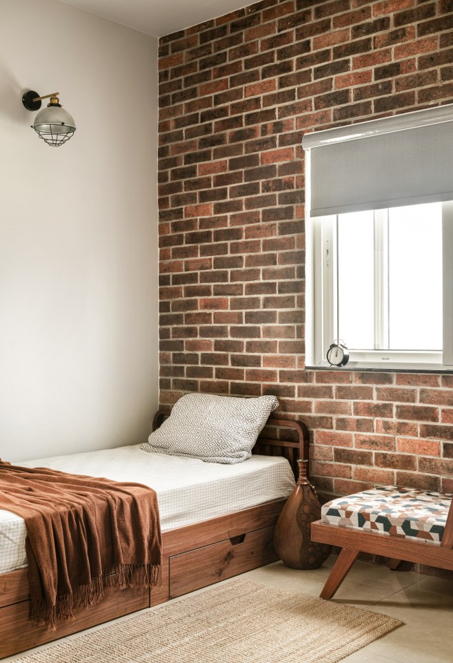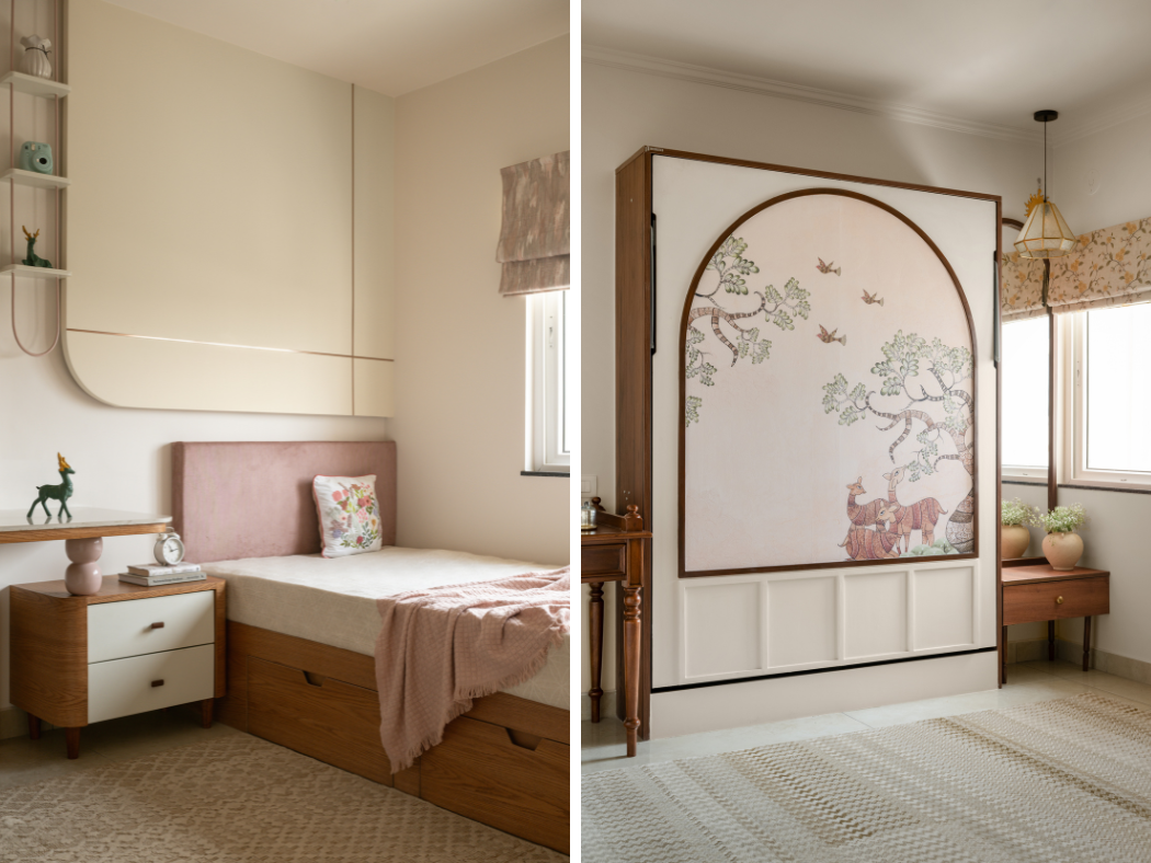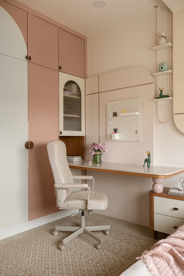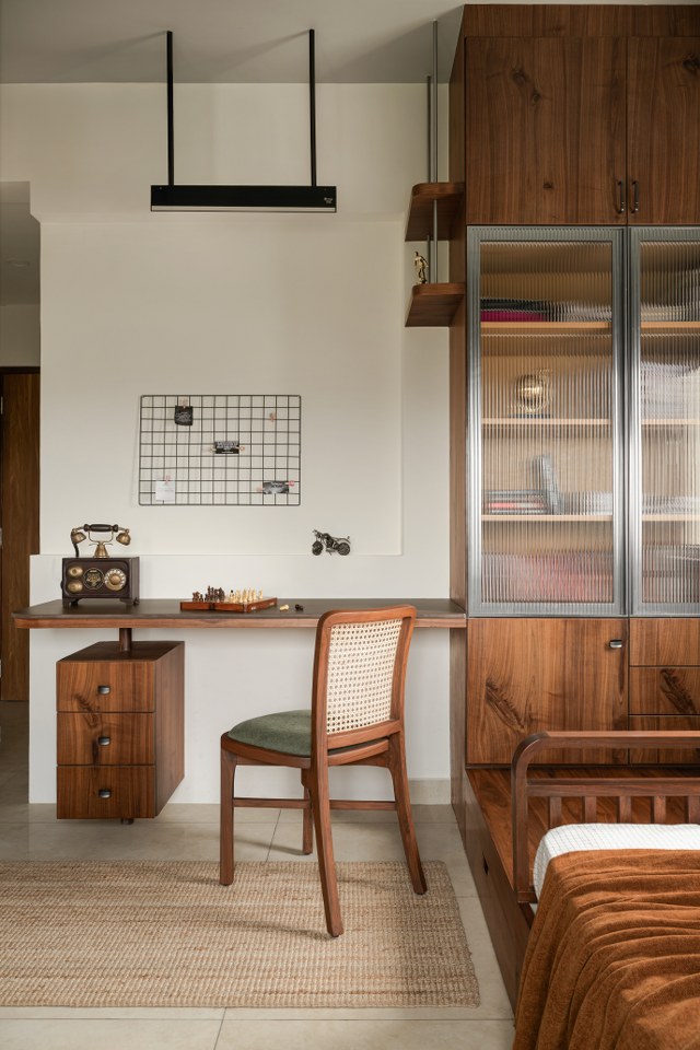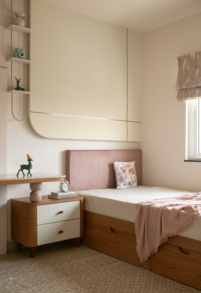 In contrast, the children’s bedrooms bring a contemporary twist. The son’s room takes on an industrial-inspired theme blending raw textures, sleek lines, and smart storage for a stylish yet practical space that adapts to different stages of life.