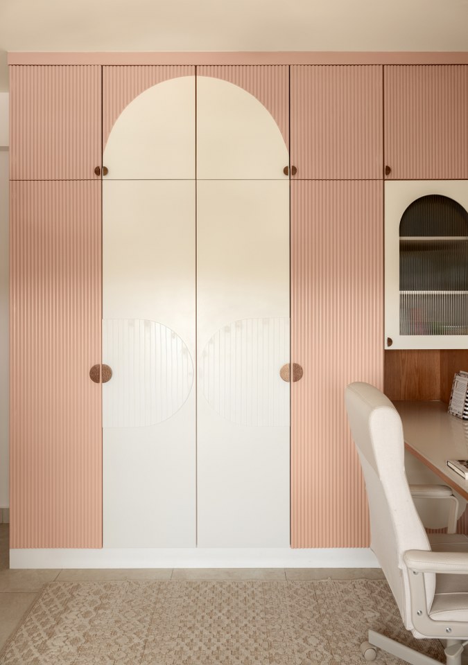 The daughter’s room softens the narrative with a chic white-and dusty pink palette and pastel rose gold accents.
