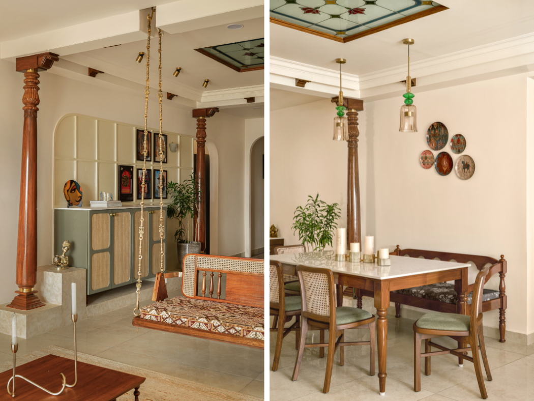 The living and dining area draws directly from the essence of the traditional wada courtyard the heart of community gatherings. Here, the dining zone is designed as the central anchor, marked by four stately pillars.