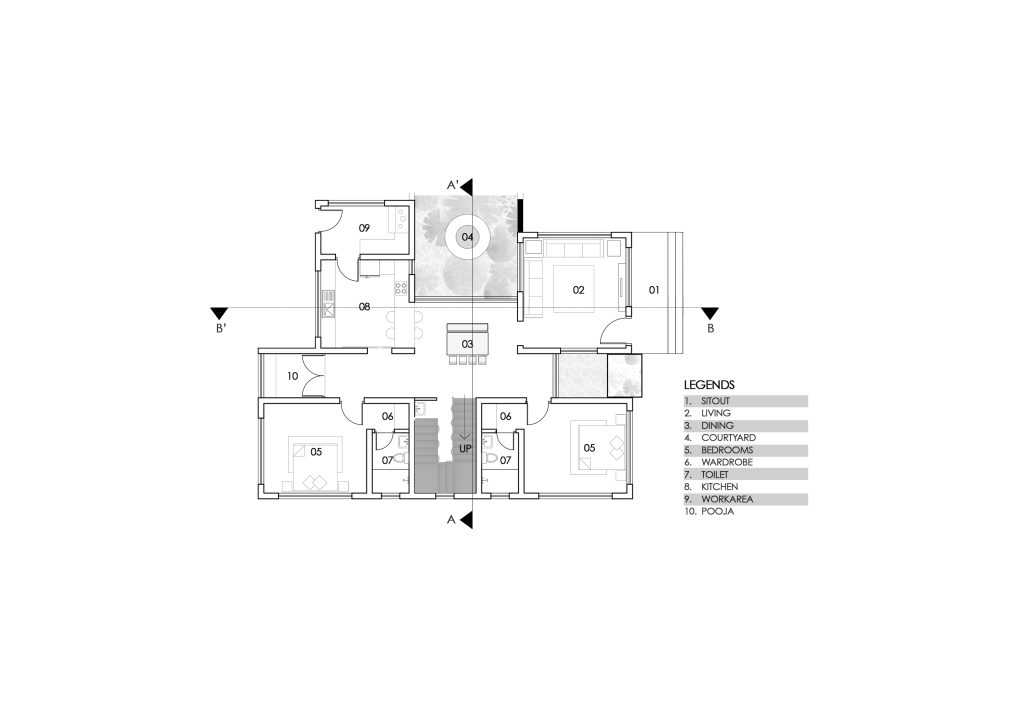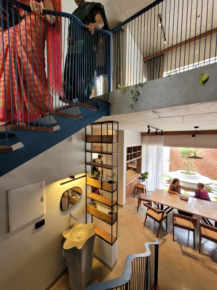The home is organized across two floors and includes four attached bedrooms designed to offer privacy without detachment. At the center of the house is a dining space that spills into a courtyard — a vital pause that blurs the formal language between the interior and the outdoors. This semi-open courtyard becomes a seasonal living space, mediating temperature, light, and sound while fostering social interactions.