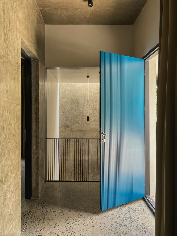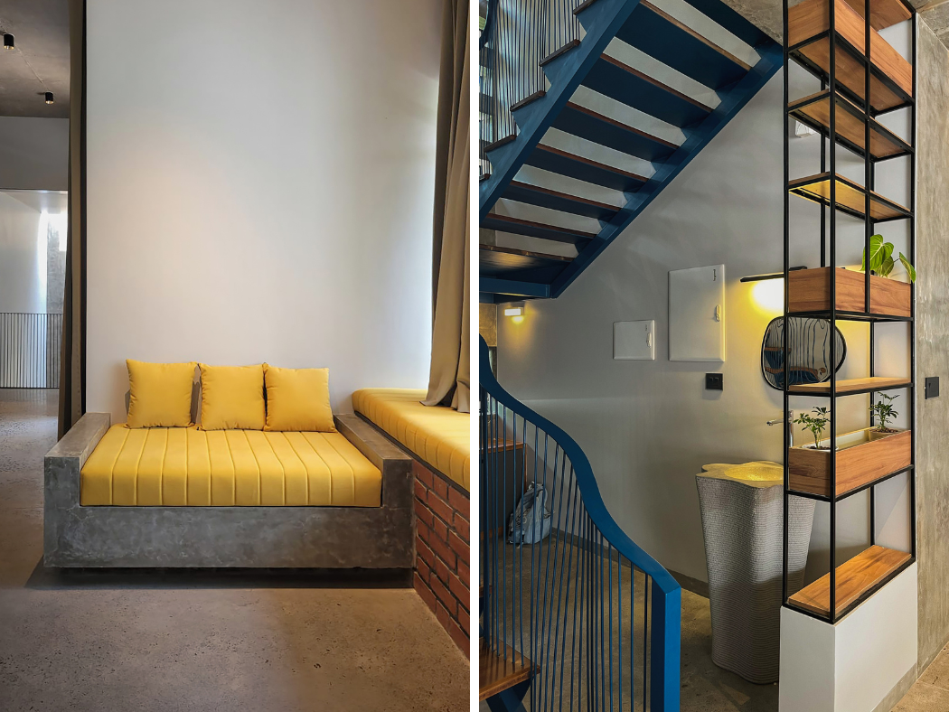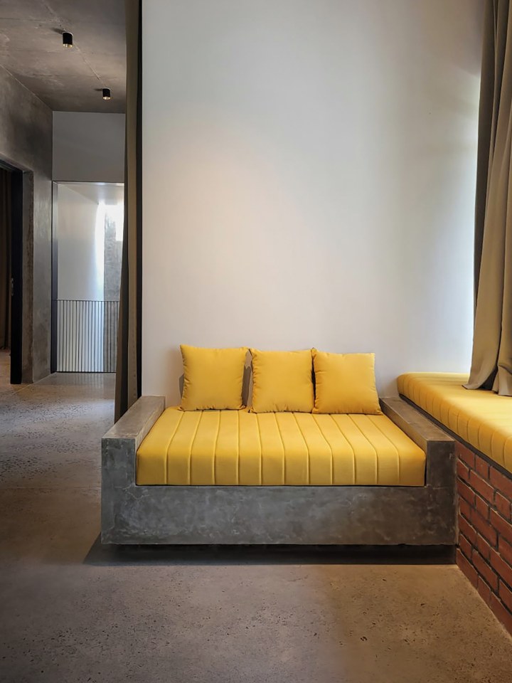The overall tonal palette remains calm — earthy reds of the brick, soft greys of concrete — forming a quiet canvas. Into this, we introduced bursts of color through select elements like turquoise doors and vibrant yellow furnishings. These accents energize the space without disrupting its serenity.