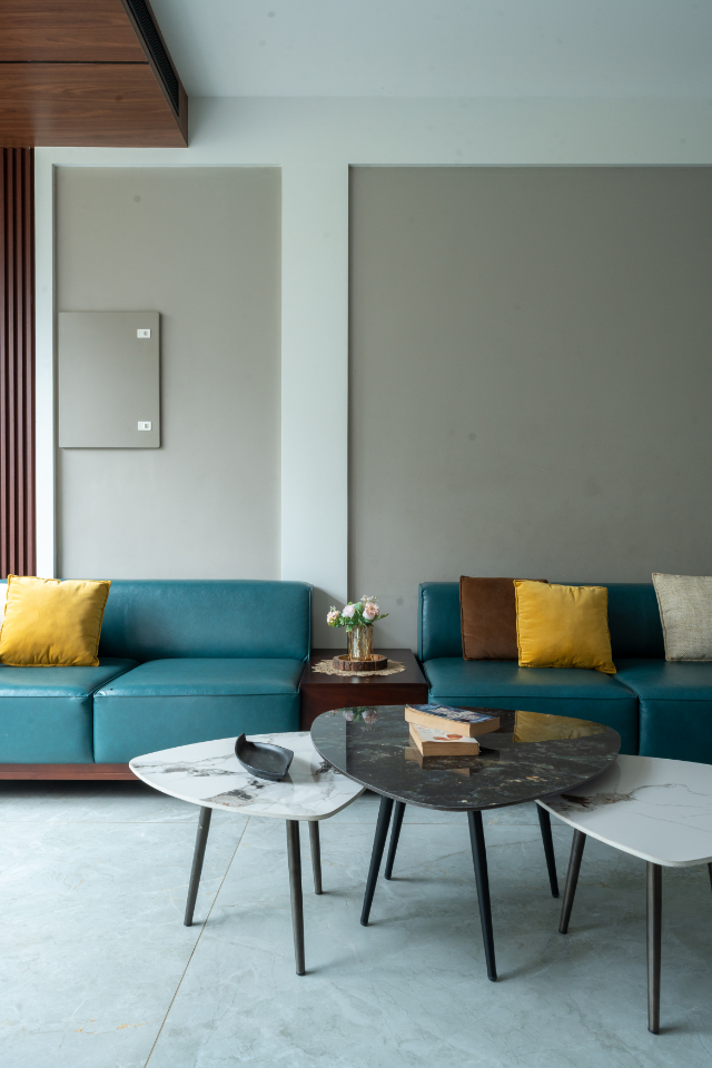 The living space is designed as a double-height volume that enhances spatial experience and ventilation. Large openings ensure ample daylight. The layout maintains a balance between openness and privacy, to maintain the family-oriented concept, allowing seamless connection with dining while remaining visually calm.