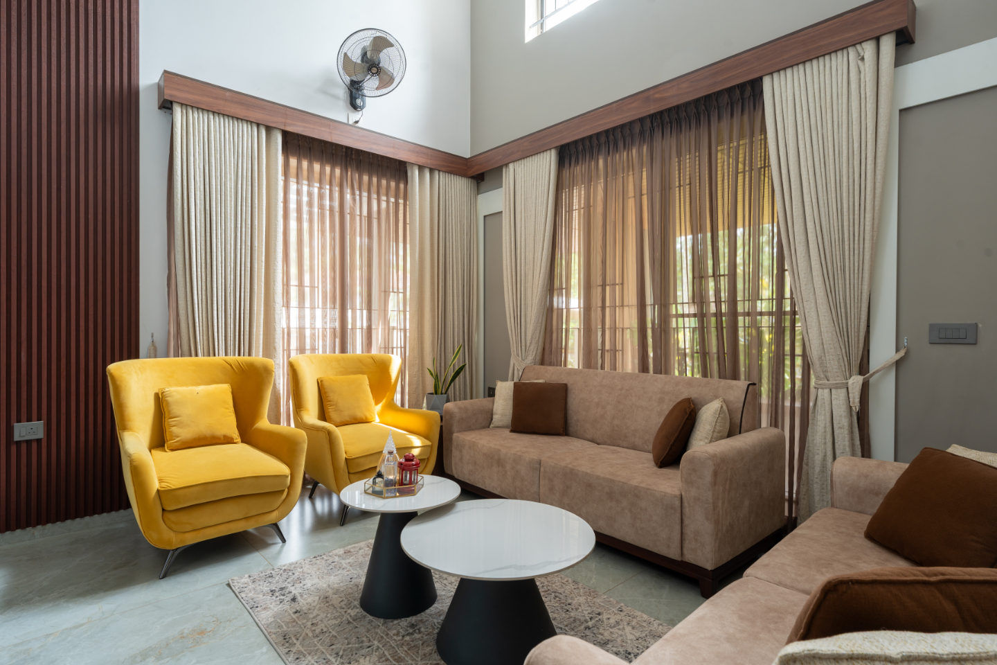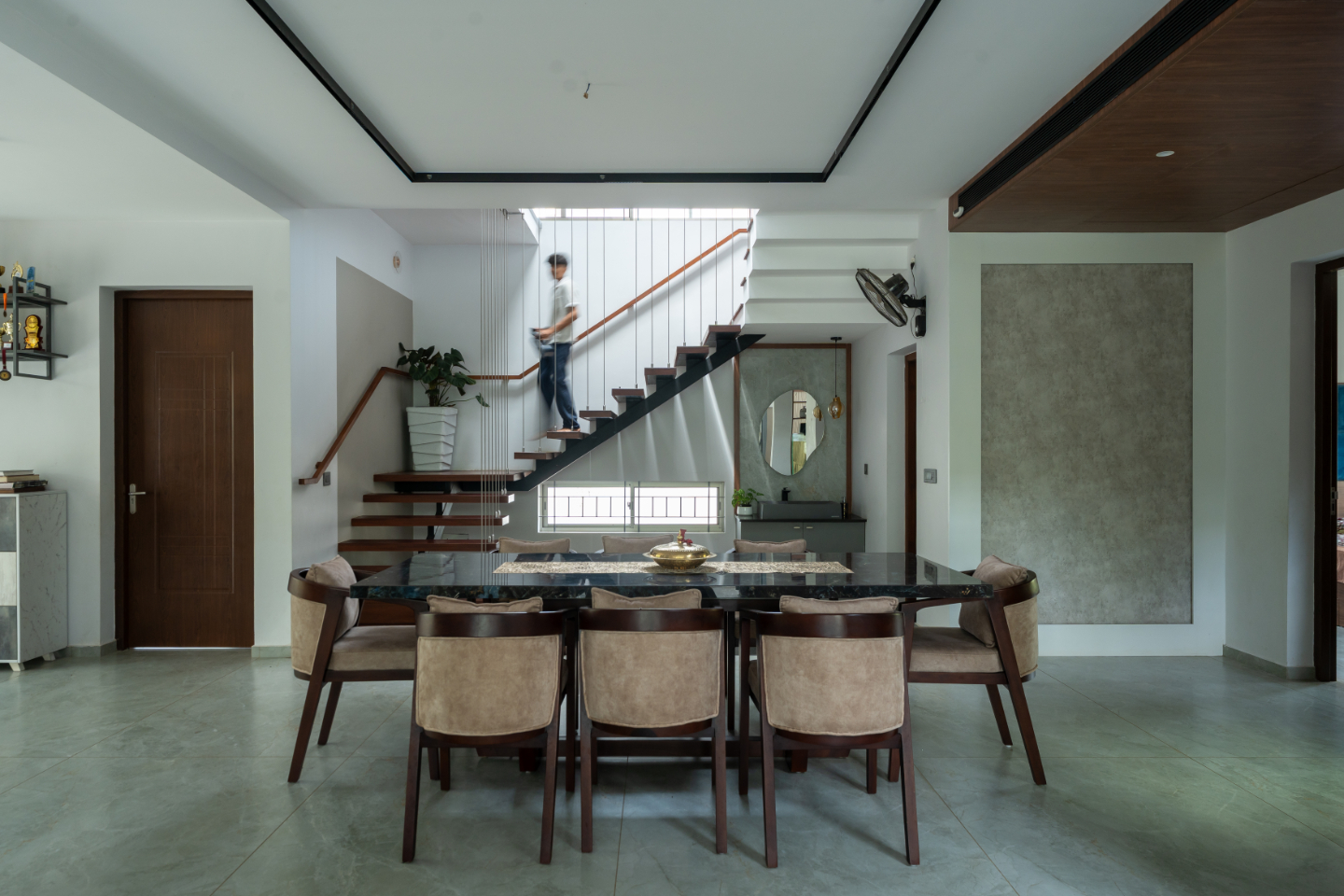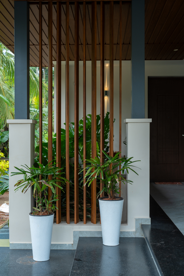 The entrance opens into a welcoming foyer that visually connects to the courtyard and staircase. Wooden finishes, PVC panels, and truss detailing add character while maintaining a modern aesthetic. The foyer sets a warm and inviting first impression.