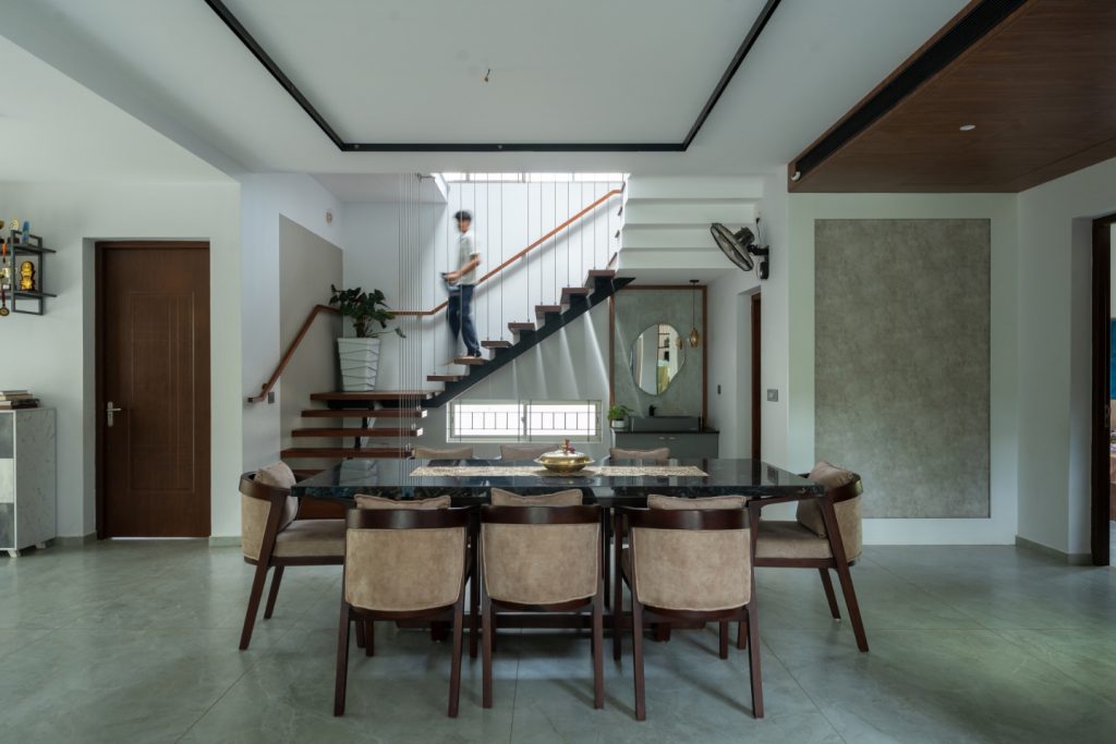 Aangan is a modern residence that seamlessly integrates with the lush environment of Kerala, showcasing a tropical home design. Designed to embrace the region’s warm climate, the house features a striking sloped terracotta roof at varying levels, enhancing both its aesthetic appeal and functional efficiency. The structure is enveloped in a vibrant tropical landscape, adorned […]