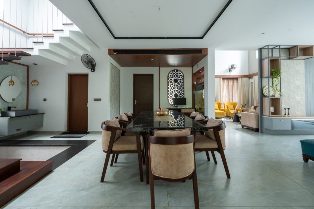 The dining area is an open and centrally located space capable of accommodating 10 people suitable for a large family.