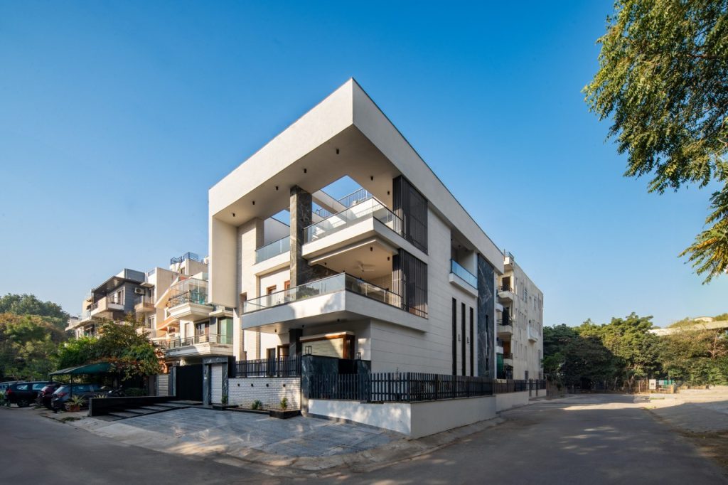 This G+2 bungalow in Gurugram embodies contemporary minimalism with a bold, monolithic form. The façade is a refined composition of clean horizontal lines, crisp white surfaces, and a rhythmic interplay of voids and projections. Textured white brickwork contrasts with sleek grey stone cladding, adding depth and visual interest.