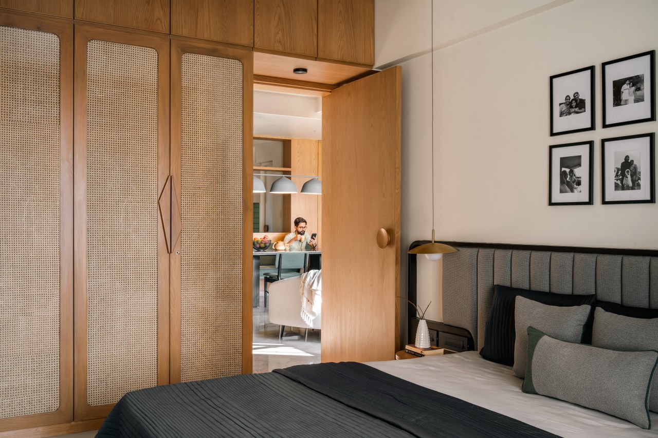 Beyond its aesthetic cohesion, the layout reveals a nuanced understanding of how Indian families live today. In a compact apartment footprint, circulation is everything. The open kitchen, framed by a subtle olive-tiled backsplash, dissolves into the larger room without compromising its identity. Meanwhile, a pooja and shoe cabinet—fused into one architectural element—serves as both a spiritual anchor and a spatial hinge, threading ritual through the everyday.