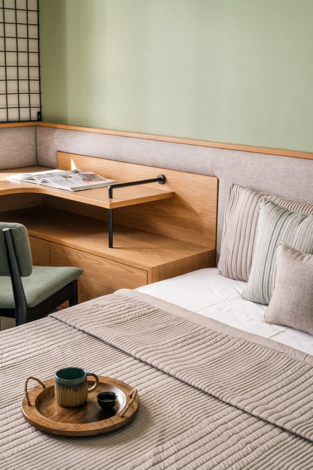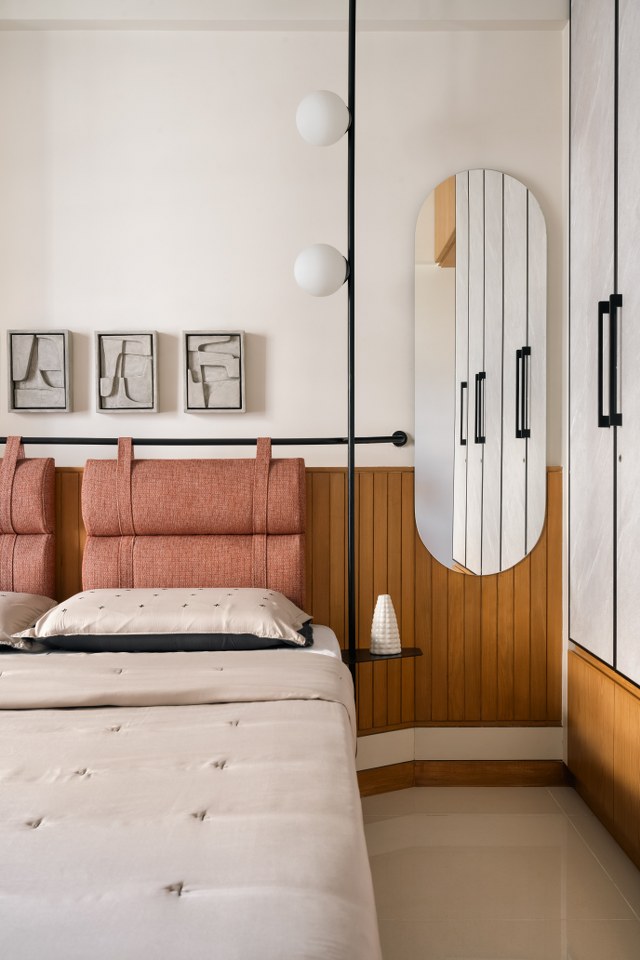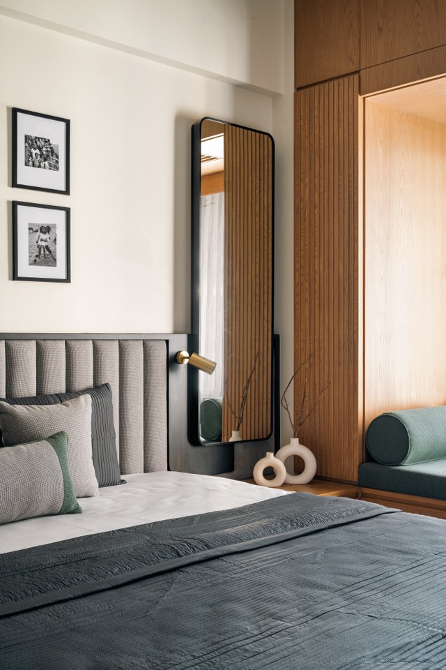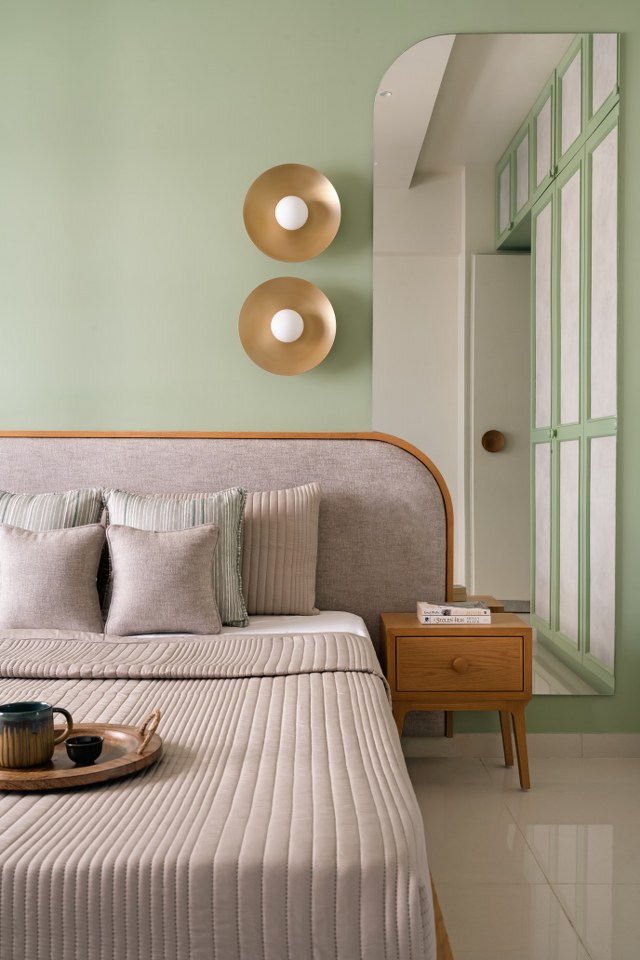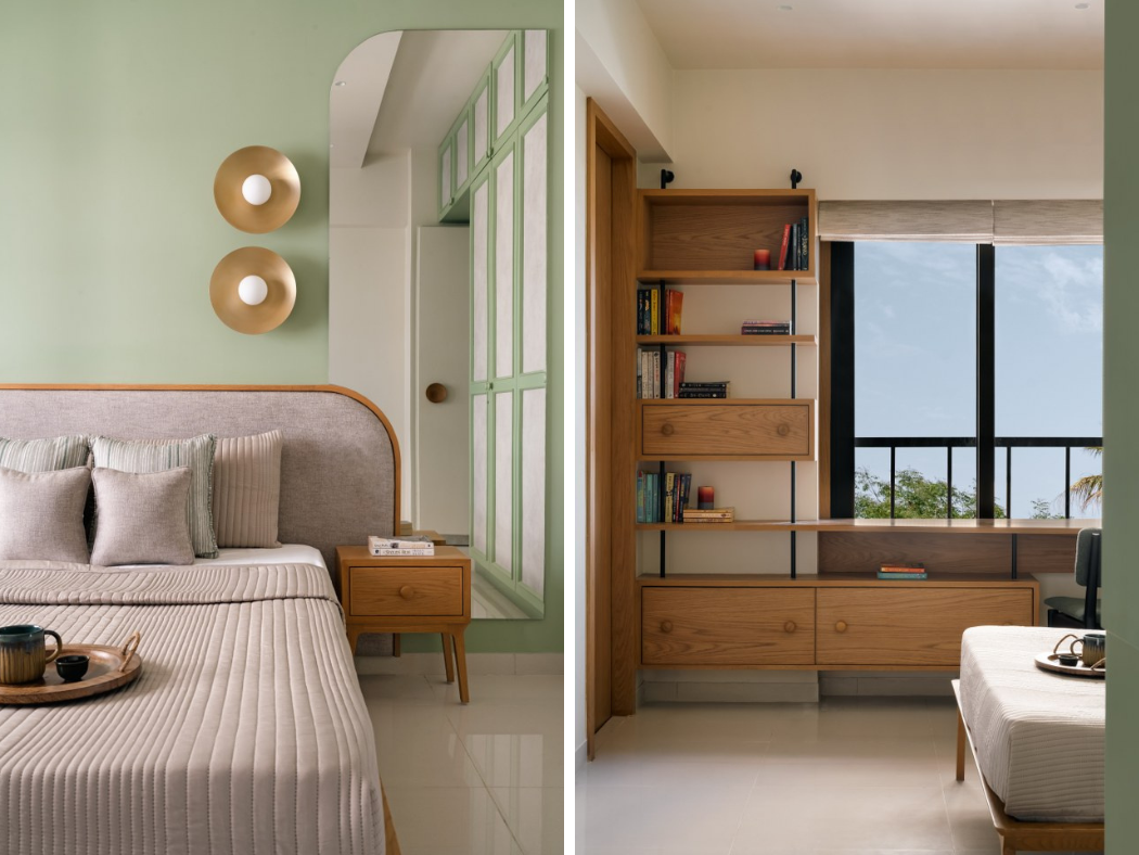 The daughter’s room is quietly radiant. A sage green palette, softened brass wall lights, and curved forms create a space that feels simultaneously youthful and timeless. The study unit, playfully asymmetric, receives generous daylight from the adjacent window.