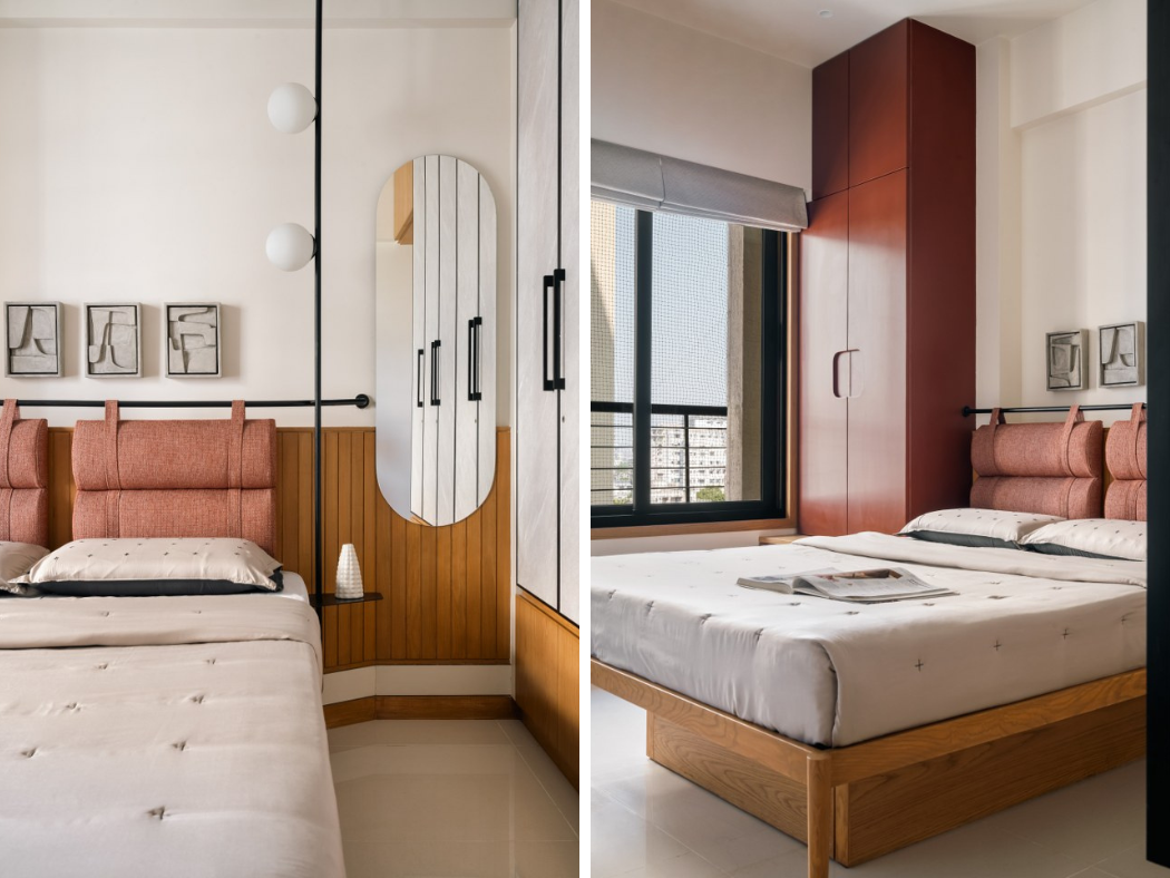 Perhaps the most emotionally complex room in the oak house belongs to the grandparents. Here, a rich terracotta headboard runs beneath a matte black metal pipe that functions as both light fixture and side table armature. This is not mere cleverness; it is care, expressed through design. It gives structure and identity to the room, while the rest of the space—warm wood cabinetry, neutral floors, framed art—stays intentionally understated. There’s no attempt to make it “modern” in the clichéd sense. Instead, it honors age by respecting comfort, clarity, and routine.
